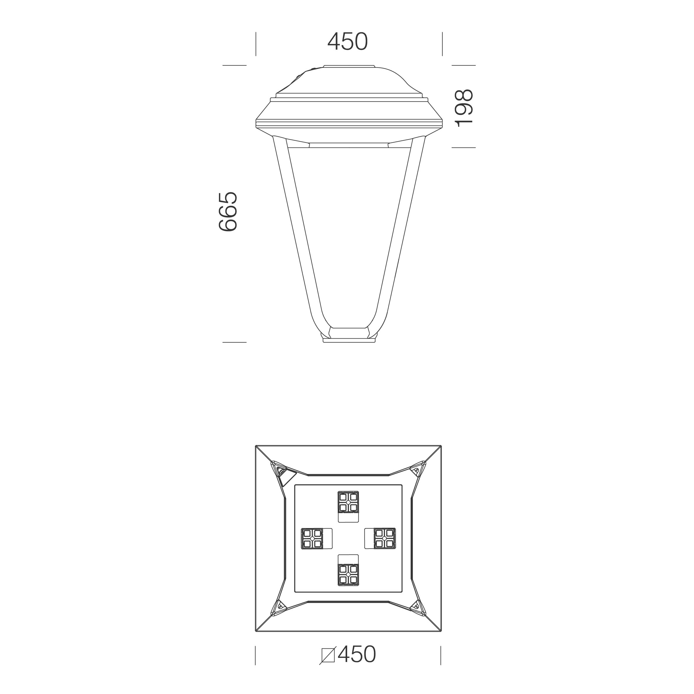 L’hsistoire du design abrite des formes classiques auxquelles il est difficile de renoncer.Le réverbère typique avec la lanterne de verre fait partie des images hsistoriques de toutes les villes, de nos souvenirs personnels. Il est une composante de la ville.La possibilité d’appliquer les nouvelles technologies à l’éclairage urbain, afin d’optimiser la qualité de la lumière tout en utilisant moins d'énergie, peut se conjuguer avec le souhsait de ne pas perdre une once de l’éternel chsarme des anciens réverbères.Lucerna n’est pas qu’une simple réinterprétation du lampadaire classique, mais bel et bien un nouveau projet qui propose une forme traditionnelle repensée dans les moindres détails.La lanterne est disponible en versions - ronde – avec des candélabres redessinés dans le même style, affichsant également des fantaisies particulières, comme des motifs floraux à la base ou sur la console.Corps, couvercle, branches et fixation candélabre en aluminium moulé sous pression.Écran : Verre trempé, épaisseur 5 mm, résistant au choc thermique et au choc mécanique.Peinture : cycle de peinture liquide standard, par immersion, se compose de plusieurs phases : une première phase de prétraitement superficiel du métal, une couche de peinture cataphorèse résistante à la corrosion et au brouillard salin, une couche finale de peinture liquide acrylique bi-composante stabilisée aux rayons UV.Equipment : Vis imperdables en acier inox. Articulation escamotable en acier ép. 25/10 avec pattes de fixation pour empêcher la chute accidentelle du couvercle. Sectionneur de série.Dotations : avec connecteur pour le raccordement secteur et des LED. Contrôle automatique de la température à l’intérieur du dispositif avec réarmement automatiqueAvec dispositif électronique conçu pour la protection du module LED.Avec filtre anticondensation.Économie : la possibilité de choisir le courant de pilotage des LED permet de disposer toujours de la puissance adaptée à une condition conceptuelle spécifique, en simplifiant aussi l’approche aux futurs problèmes d’entretien et d’actualisation. Le choix d’un courant plus faible augmentera l’efficacité, en améliorant donc l’économie d’énergie, tandis qu’un courant plus fort permettra d’obtenir davantage de lumière et de réduire le nombre des appareils.