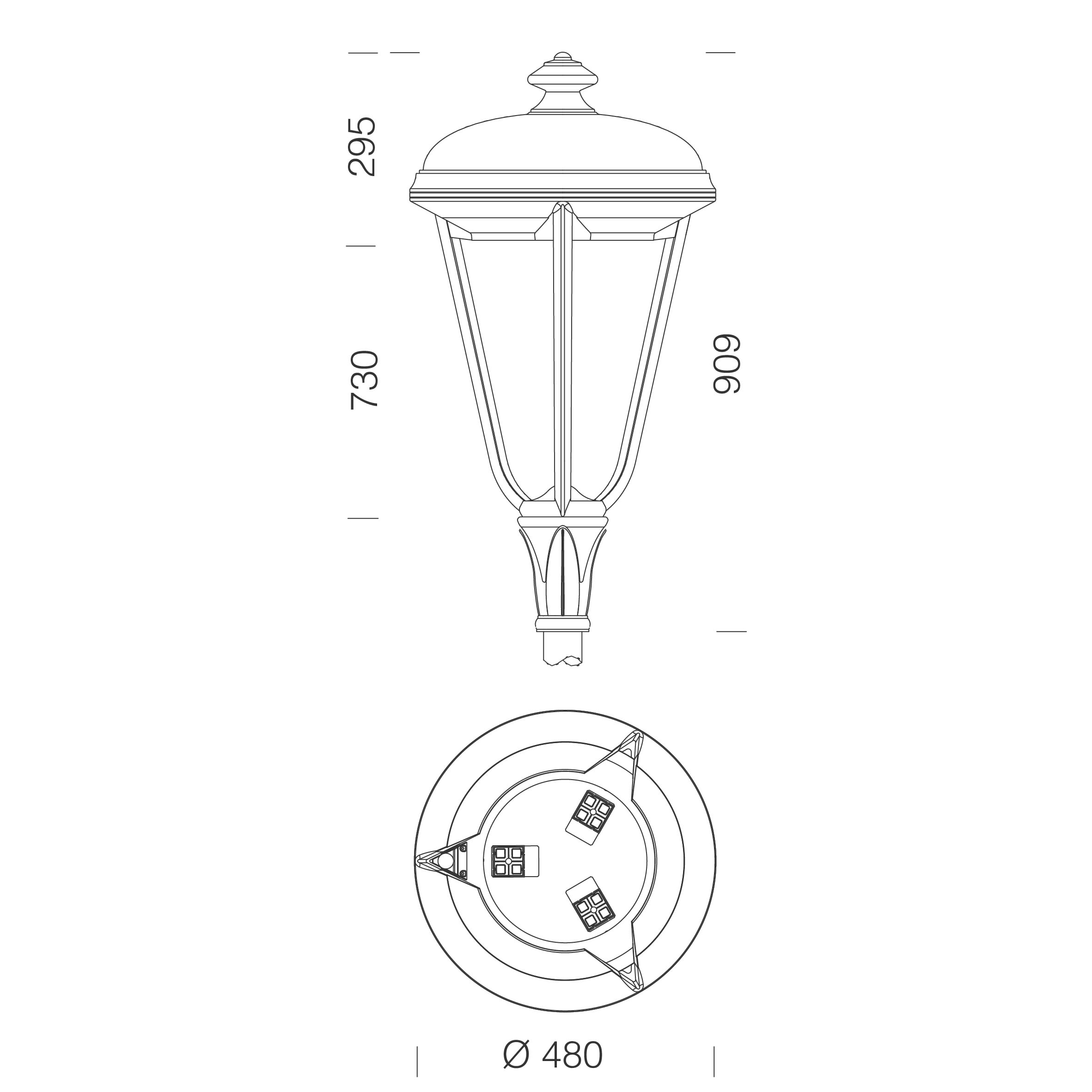 L’hsistoire du design abrite des formes classiques auxquelles il est difficile de renoncer.Le réverbère typique avec la lanterne de verre fait partie des images hsistoriques de toutes les villes, de nos souvenirs personnels. Il est une composante de la ville.La possibilité d’appliquer les nouvelles technologies à l’éclairage urbain, afin d’optimiser la qualité de la lumière tout en utilisant moins d'énergie, peut se conjuguer avec le souhsait de ne pas perdre une once de l’éternel chsarme des anciens réverbères.Lucerna n’est pas qu’une simple réinterprétation du lampadaire classique, mais bel et bien un nouveau projet qui propose une forme traditionnelle repensée dans les moindres détails.La lanterne est disponible en versions - ronde – avec des candélabres redessinés dans le même style, affichsant également des fantaisies particulières, comme des motifs floraux à la base ou sur la console.Corps, couvercle, branches et fixation candélabre en aluminium moulé sous pression.Écran : Verre trempé, épaisseur 5 mm, résistant au choc thermique et au choc mécanique.Peinture : cycle de peinture liquide standard, par immersion, se compose de plusieurs phases : une première phase de prétraitement superficiel du métal, une couche de peinture cataphorèse résistante à la corrosion et au brouillard salin, une couche finale de peinture liquide acrylique bi-composante stabilisée aux rayons UV.Equipment : Vis imperdables en acier inox. Articulation escamotable en acier ép. 25/10 avec pattes de fixation pour empêcher la chute accidentelle du couvercle. Sectionneur de série.Dotations : avec connecteur pour le raccordement secteur et des LED. Contrôle automatique de la température à l’intérieur du dispositif avec réarmement automatiqueAvec dispositif électronique conçu pour la protection du module LED.Avec filtre anticondensation.Économie : la possibilité de choisir le courant de pilotage des LED permet de disposer toujours de la puissance adaptée à une condition conceptuelle spécifique, en simplifiant aussi l’approche aux futurs problèmes d’entretien et d’actualisation. Le choix d’un courant plus faible augmentera l’efficacité, en améliorant donc l’économie d’énergie, tandis qu’un courant plus fort permettra d’obtenir davantage de lumière et de réduire le nombre des appareils.