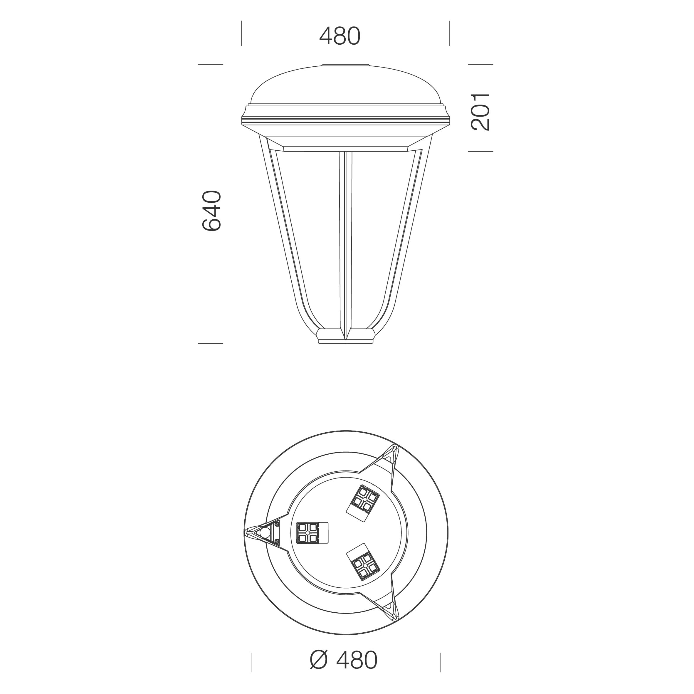 L’hsistoire du design abrite des formes classiques auxquelles il est difficile de renoncer.Le réverbère typique avec la lanterne de verre fait partie des images hsistoriques de toutes les villes, de nos souvenirs personnels. Il est une composante de la ville.La possibilité d’appliquer les nouvelles technologies à l’éclairage urbain, afin d’optimiser la qualité de la lumière tout en utilisant moins d'énergie, peut se conjuguer avec le souhsait de ne pas perdre une once de l’éternel chsarme des anciens réverbères.Lucerna n’est pas qu’une simple réinterprétation du lampadaire classique, mais bel et bien un nouveau projet qui propose une forme traditionnelle repensée dans les moindres détails.La lanterne est disponible en versions - ronde – avec des candélabres redessinés dans le même style, affichsant également des fantaisies particulières, comme des motifs floraux à la base ou sur la console.Corps, couvercle, branches et fixation candélabre en aluminium moulé sous pression.Écran : Verre trempé, épaisseur 5 mm, résistant au choc thermique et au choc mécanique.Peinture : cycle de peinture liquide standard, par immersion, se compose de plusieurs phases : une première phase de prétraitement superficiel du métal, une couche de peinture cataphorèse résistante à la corrosion et au brouillard salin, une couche finale de peinture liquide acrylique bi-composante stabilisée aux rayons UV.Equipment : Vis imperdables en acier inox. Articulation escamotable en acier ép. 25/10 avec pattes de fixation pour empêcher la chute accidentelle du couvercle. Sectionneur de série.Dotations : avec connecteur pour le raccordement secteur et des LED. Contrôle automatique de la température à l’intérieur du dispositif avec réarmement automatiqueAvec dispositif électronique conçu pour la protection du module LED.Avec filtre anticondensation.Économie : la possibilité de choisir le courant de pilotage des LED permet de disposer toujours de la puissance adaptée à une condition conceptuelle spécifique, en simplifiant aussi l’approche aux futurs problèmes d’entretien et d’actualisation. Le choix d’un courant plus faible augmentera l’efficacité, en améliorant donc l’économie d’énergie, tandis qu’un courant plus fort permettra d’obtenir davantage de lumière et de réduire le nombre des appareils.