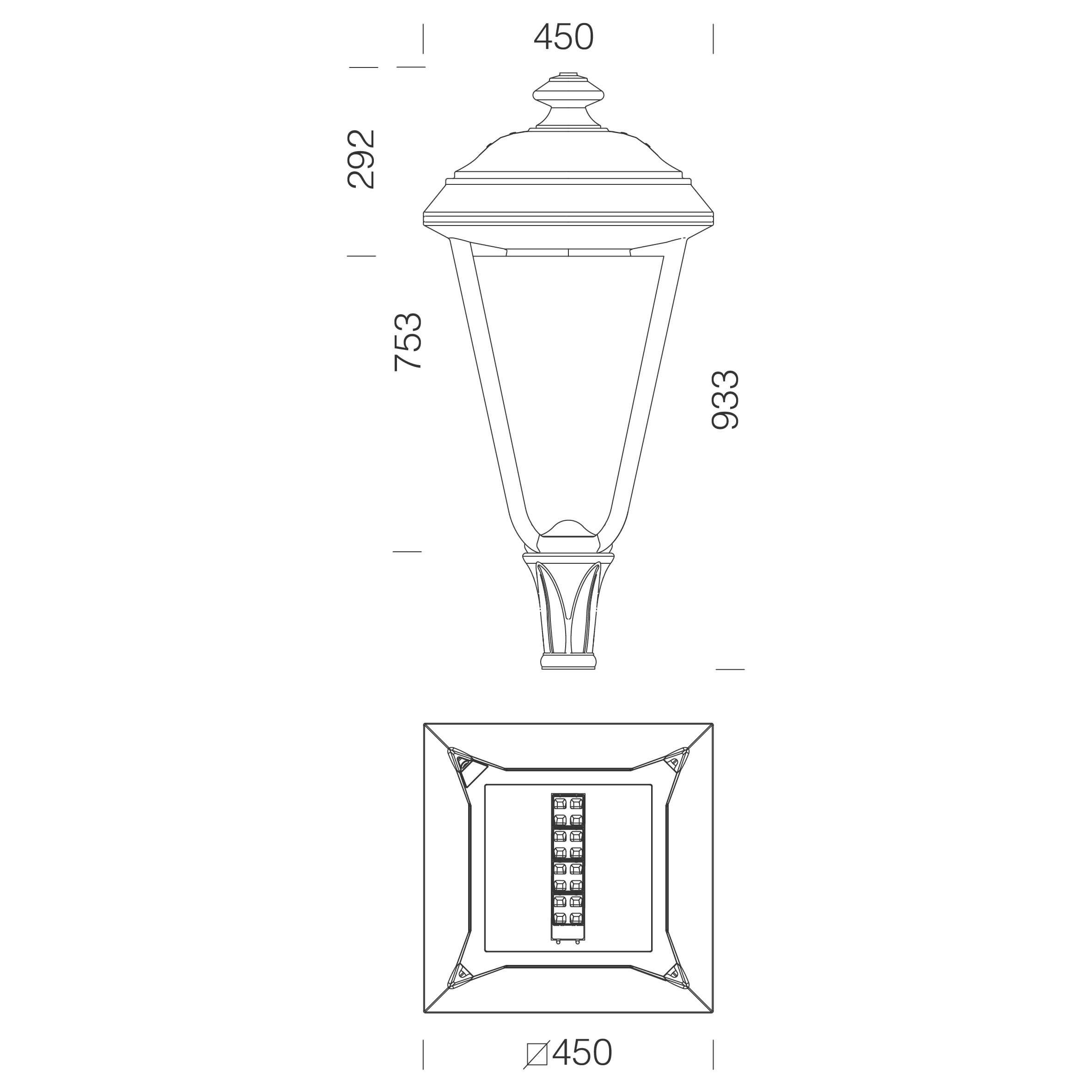 L’hsistoire du design abrite des formes classiques auxquelles il est difficile de renoncer.Le réverbère typique avec la lanterne de verre fait partie des images hsistoriques de toutes les villes, de nos souvenirs personnels. Il est une composante de la ville.La possibilité d’appliquer les nouvelles technologies à l’éclairage urbain, afin d’optimiser la qualité de la lumière tout en utilisant moins d'énergie, peut se conjuguer avec le souhsait de ne pas perdre une once de l’éternel chsarme des anciens réverbères.Lucerna n’est pas qu’une simple réinterprétation du lampadaire classique, mais bel et bien un nouveau projet qui propose une forme traditionnelle repensée dans les moindres détails.La lanterne est disponible en versions - ronde – avec des candélabres redessinés dans le même style, affichsant également des fantaisies particulières, comme des motifs floraux à la base ou sur la console.Corps, couvercle, branches et fixation candélabre en aluminium moulé sous pression.Écran : Verre trempé, épaisseur 5 mm, résistant au choc thermique et au choc mécanique.Peinture : cycle de peinture liquide standard, par immersion, se compose de plusieurs phases : une première phase de prétraitement superficiel du métal, une couche de peinture cataphorèse résistante à la corrosion et au brouillard salin, une couche finale de peinture liquide acrylique bi-composante stabilisée aux rayons UV.Equipment : Vis imperdables en acier inox. Articulation escamotable en acier ép. 25/10 avec pattes de fixation pour empêcher la chute accidentelle du couvercle. Sectionneur de série.Dotations : avec connecteur pour le raccordement secteur et des LED. Contrôle automatique de la température à l’intérieur du dispositif avec réarmement automatiqueAvec dispositif électronique conçu pour la protection du module LED.Avec filtre anticondensation.Économie : la possibilité de choisir le courant de pilotage des LED permet de disposer toujours de la puissance adaptée à une condition conceptuelle spécifique, en simplifiant aussi l’approche aux futurs problèmes d’entretien et d’actualisation. Le choix d’un courant plus faible augmentera l’efficacité, en améliorant donc l’économie d’énergie, tandis qu’un courant plus fort permettra d’obtenir davantage de lumière et de réduire le nombre des appareils.