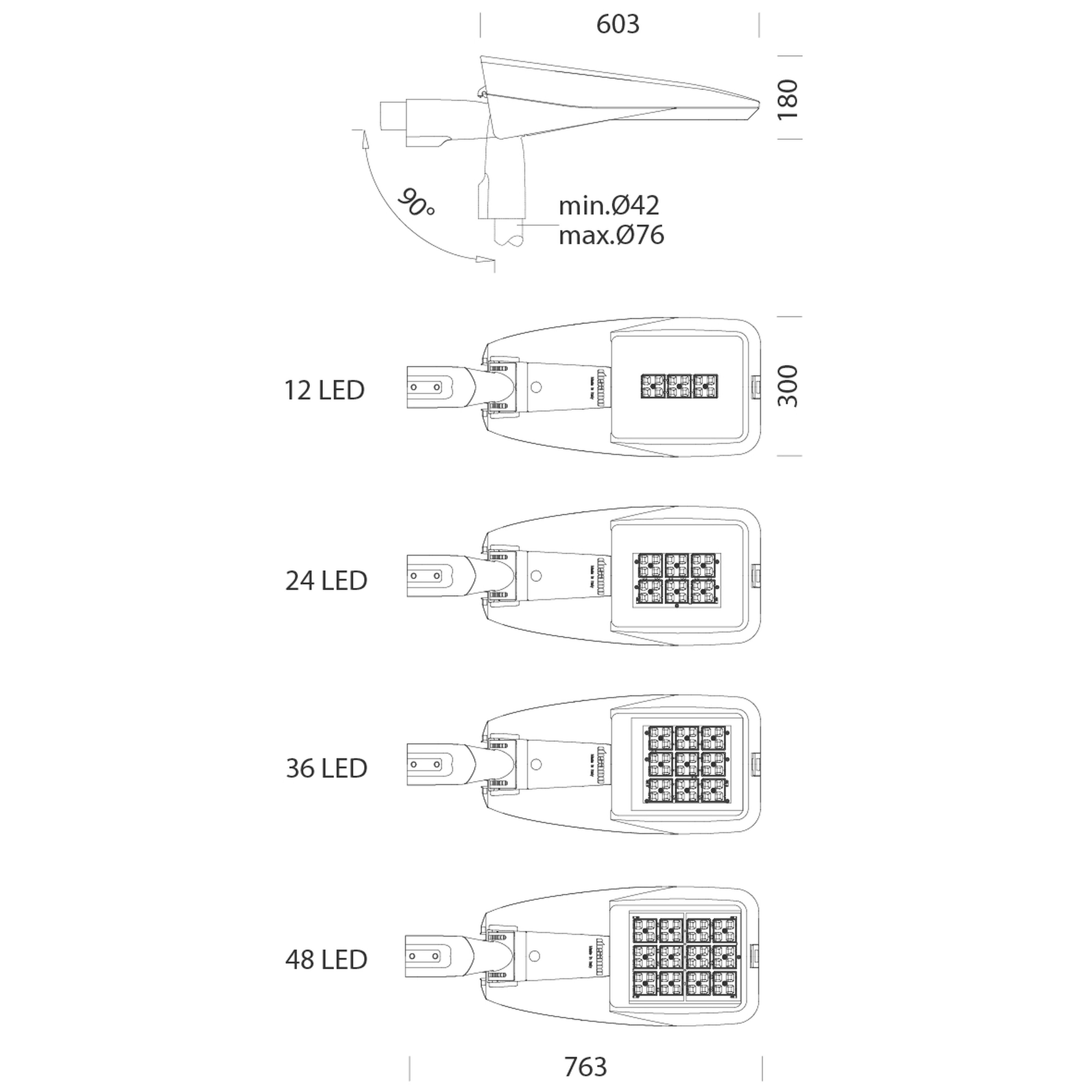 Lanterne d'éclairage public, la Sella fait partie des premières générations LED et elle est régulièrement upgradée en technologie.Il existe différentes versions de SellaLes tailles vont de 600mm à 960mm et les puissances de 18w à 255w.Les flux vont de 2722lms à 30000lms.La Sella s'adapte à toutes les hauteurs.Sa technologie est à la pointe et ses systèmes divers de gestions sont grands.Corps et couvercle : aluminium moulé sous pression, profil aérodynamique avec petite surface d'exposition au vent. Ailettes de refroidissement incorporées dans le capot. Optique : aluminium avec revêtement PVD argent pur à 99, 99%.Raccord mât : en aluminium moulé sous pression. Parfait pour les mâts de 42-76 mm de diamètre. Orientable de 0° à 20° pour fixation sur la crosse, et de 0° à 20° pour fixation en sommet de mât. Inclinaison par 5 degrés. Diffuseur : verre trempé ultra clair épaisseur 4 mm résistant aux chocs thermiques et mécaniques (UNI NF EN 12150-1/ 2001).Peinture : le cycle de peinture poudre standard se compose d'une phase de prétraitement superficiel du métal et d'une passe de peinture poudre polyester en couche simple, résistante à la corrosion et au brouillard salin, stabilisée aux rayons UV.Le luminaire Sella résiste à 2 000 h d'exposition au brouillard salin conformément à la norme ASTM B 117, et à 2 000 h d'exposition au rayonnement UV/à la condensation d'eau conformément à la norme ASTM G 154.Équipement : sectionneur de série classe II qui coupe l'alimentation électronique à l'ouverture du capot. Protection contre les impulsions conforme à la norme EN 61547 pour la platine Led et son driver. Connecteur externe pour une installation rapide.