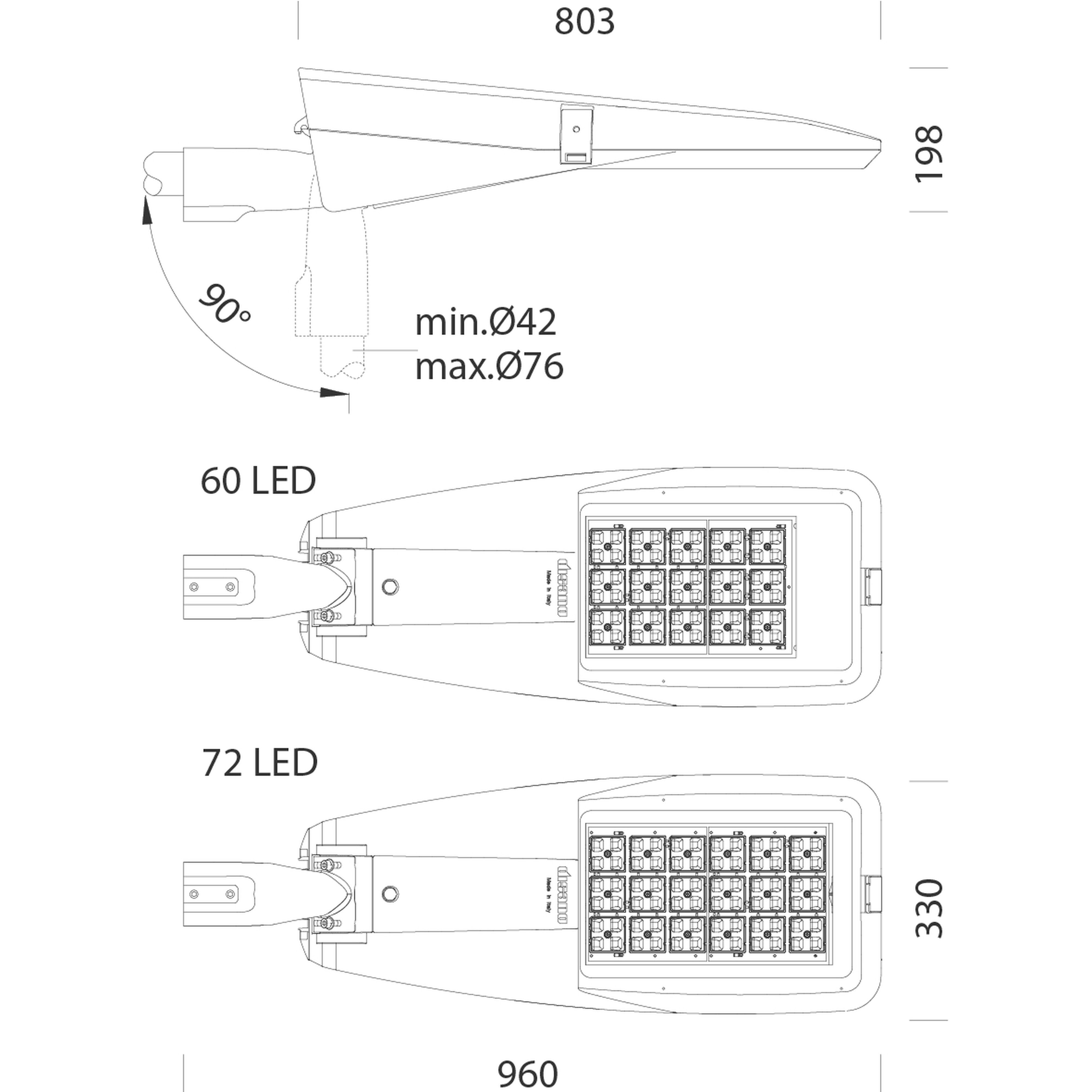 Lanterne d'éclairage public, la Sella fait partie des premières générations LED et elle est régulièrement upgradée en technologie.Il existe différentes versions de SellaLes tailles vont de 600mm à 960mm et les puissances de 18w à 255w.Les flux vont de 2722lms à 30000lms.La Sella s'adapte à toutes les hauteurs.Sa technologie est à la pointe et ses systèmes divers de gestions sont grands.Corps et couvercle : aluminium moulé sous pression, profil aérodynamique avec petite surface d'exposition au vent. Ailettes de refroidissement incorporées dans le capot. Optique : aluminium avec revêtement PVD argent pur à 99, 99%.Raccord mât : en aluminium moulé sous pression. Parfait pour les mâts de 42-76 mm de diamètre. Orientable de 0° à 20° pour fixation sur la crosse, et de 0° à 20° pour fixation en sommet de mât. Inclinaison par 5 degrés. Diffuseur : verre trempé ultra clair épaisseur 4 mm résistant aux chocs thermiques et mécaniques (UNI NF EN 12150-1/ 2001).Peinture : le cycle de peinture poudre standard se compose d'une phase de prétraitement superficiel du métal et d'une passe de peinture poudre polyester en couche simple, résistante à la corrosion et au brouillard salin, stabilisée aux rayons UV.Le luminaire Sella résiste à 2 000 h d'exposition au brouillard salin conformément à la norme ASTM B 117, et à 2 000 h d'exposition au rayonnement UV/à la condensation d'eau conformément à la norme ASTM G 154.Équipement : sectionneur de série classe II qui coupe l'alimentation électronique à l'ouverture du capot. Protection contre les impulsions conforme à la norme EN 61547 pour la platine Led et son driver. Connecteur externe pour une installation rapide.