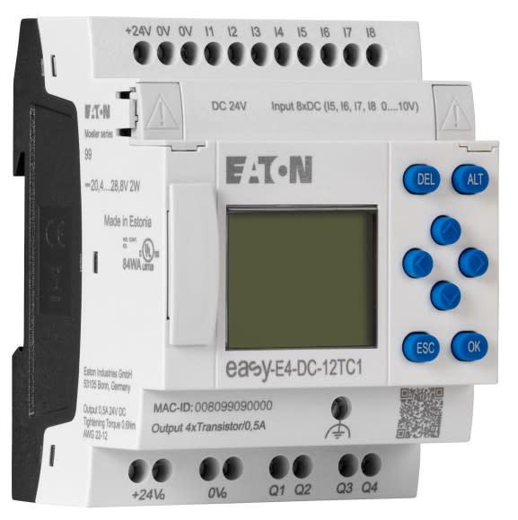 Avec les modules logiques easyE4 de la série Moeller d'Eaton, la mise en œuvre des tâches de commande est désormais rapide et efficace, que ce soit dans les applications industrielles, de bâtiment et de construction spécialisée. Jusqu'à 11 extensions d'E/S ainsi qu'une large gamme de tensions sont disponibles.Les nouveaux appareils easyE4 sont non seulement faciles à utiliser, mais ils offrent également une programmation simple et flexible.Avec quatre langages de programmation différents, le logiciel easySoft est intuitif et facile à utiliser.L'ajout d'autres fonctions, telles que le serveur web intégré et l'interface Ethernet, font de l'easyE4 un module logique performant compatible avec l'architecture des systèmes IIoT.