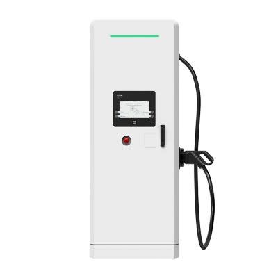 Borne de recharge VE tertiaire DC 60KW 1xCCS2 160A + DC MID + TPE RFID IP55 IK10. Webserver intégré pour mise en service facilité. Ecran de 10 pouces. 4 boutons poussoirs. Tension de sortie max 1000 VDC.