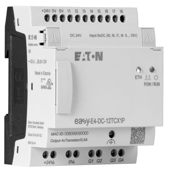 Avec les modules logiques easyE4 de la série Moeller d'Eaton, la mise en œuvre des tâches de commande est désormais rapide et efficace, que ce soit dans les applications industrielles, de bâtiment et de construction spécialisée. Jusqu'à 11 extensions d'E/S ainsi qu'une large gamme de tensions sont disponibles.Les nouveaux appareils easyE4 sont non seulement faciles à utiliser, mais ils offrent également une programmation simple et flexible.Avec quatre langages de programmation différents, le logiciel easySoft est intuitif et facile à utiliser.L'ajout d'autres fonctions, telles que le serveur web intégré et l'interface Ethernet, font de l'easyE4 un module logique performant compatible avec l'architecture des systèmes IIoT.
