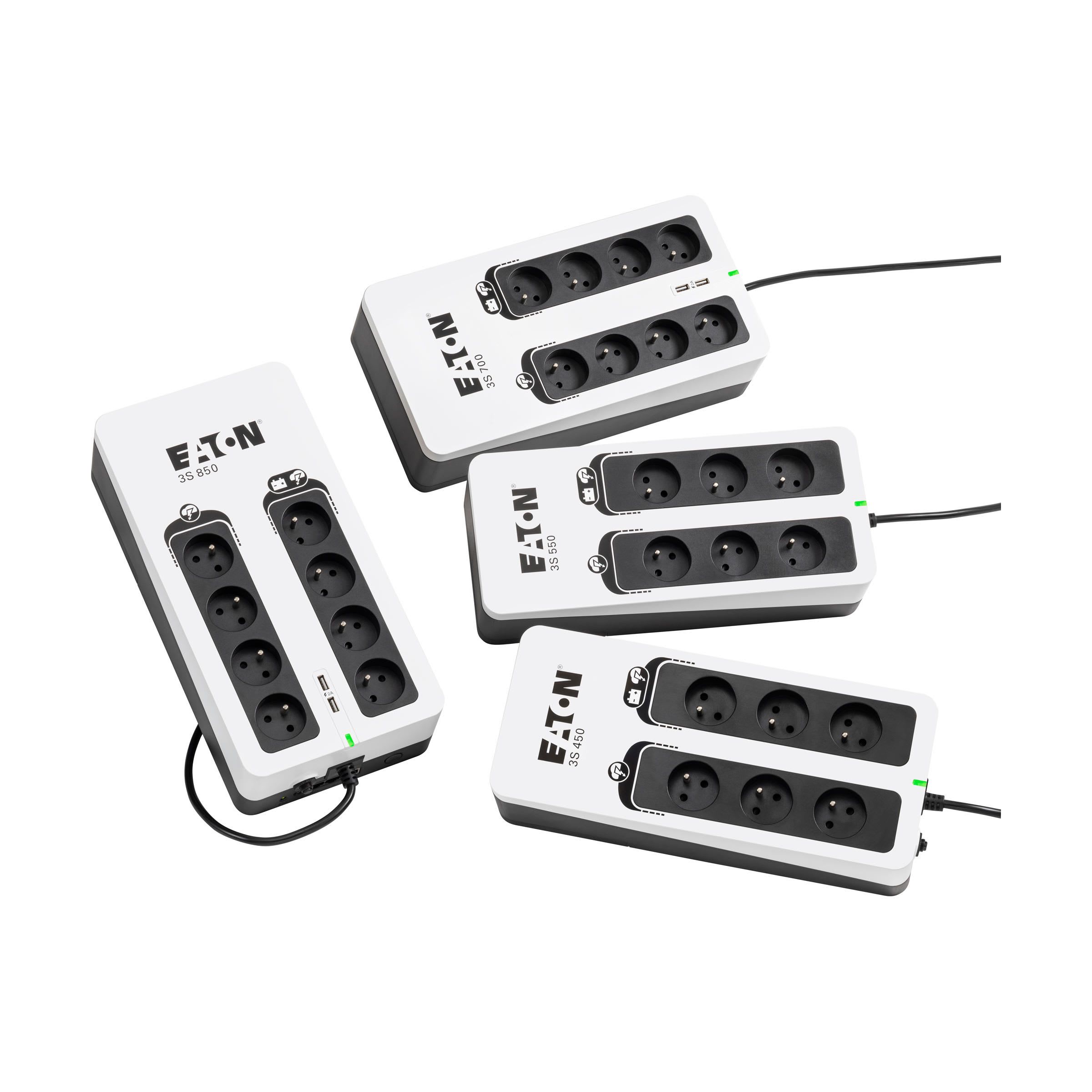 Eaton 3S 450-850 VAEaton 3S est la 2eme génération de combiné onduleur – multiprise – parafoudre.Avec son design moderne, ces 6 ou 8 prises parafoudres, ces 2 chargeurs USB, c’est toute l’expertise Eaton ,leader mondial de l’onduleur, condensée en seul produit pour la protection des applications domestiques (box, NAS, consoles) et bureautiques (poste de travail).