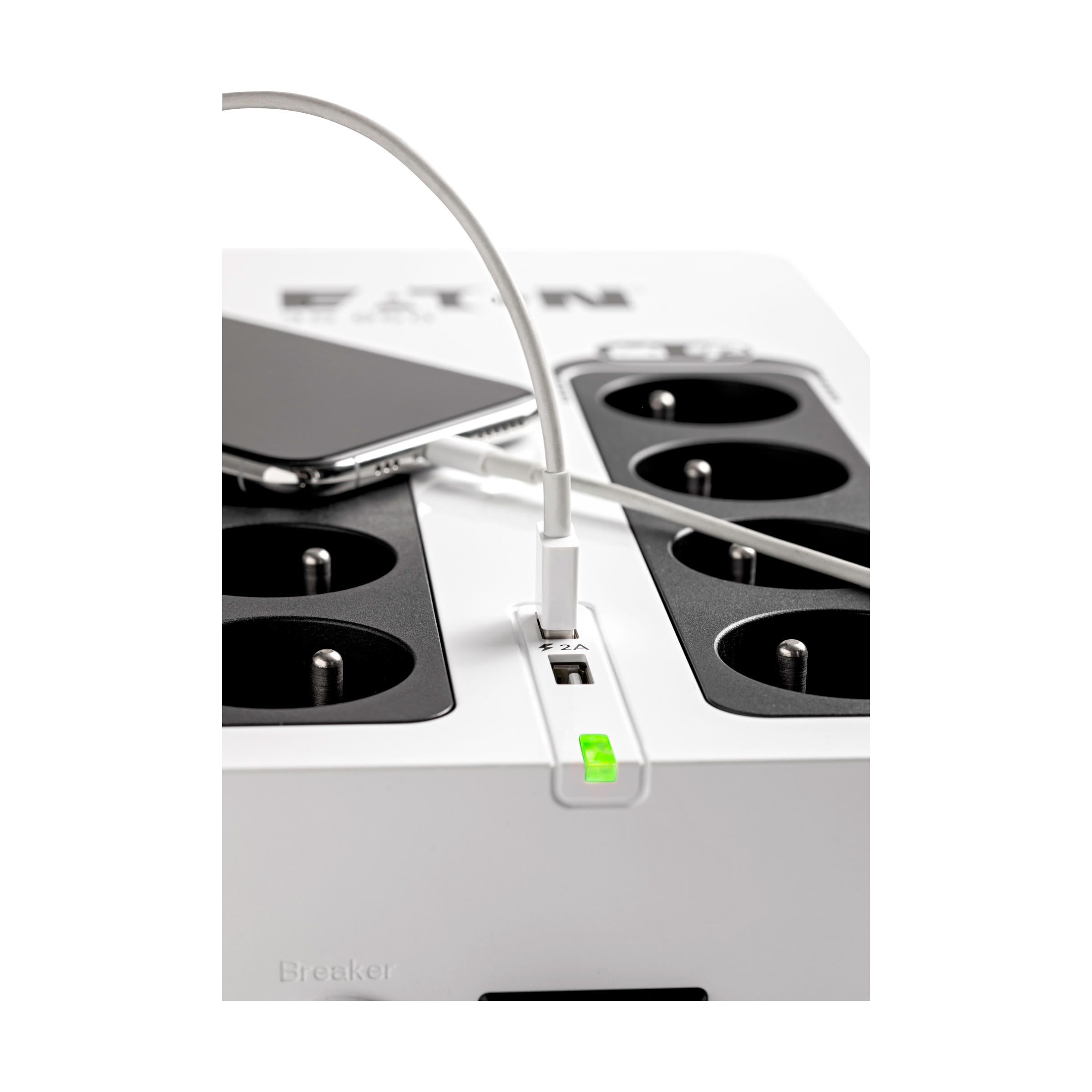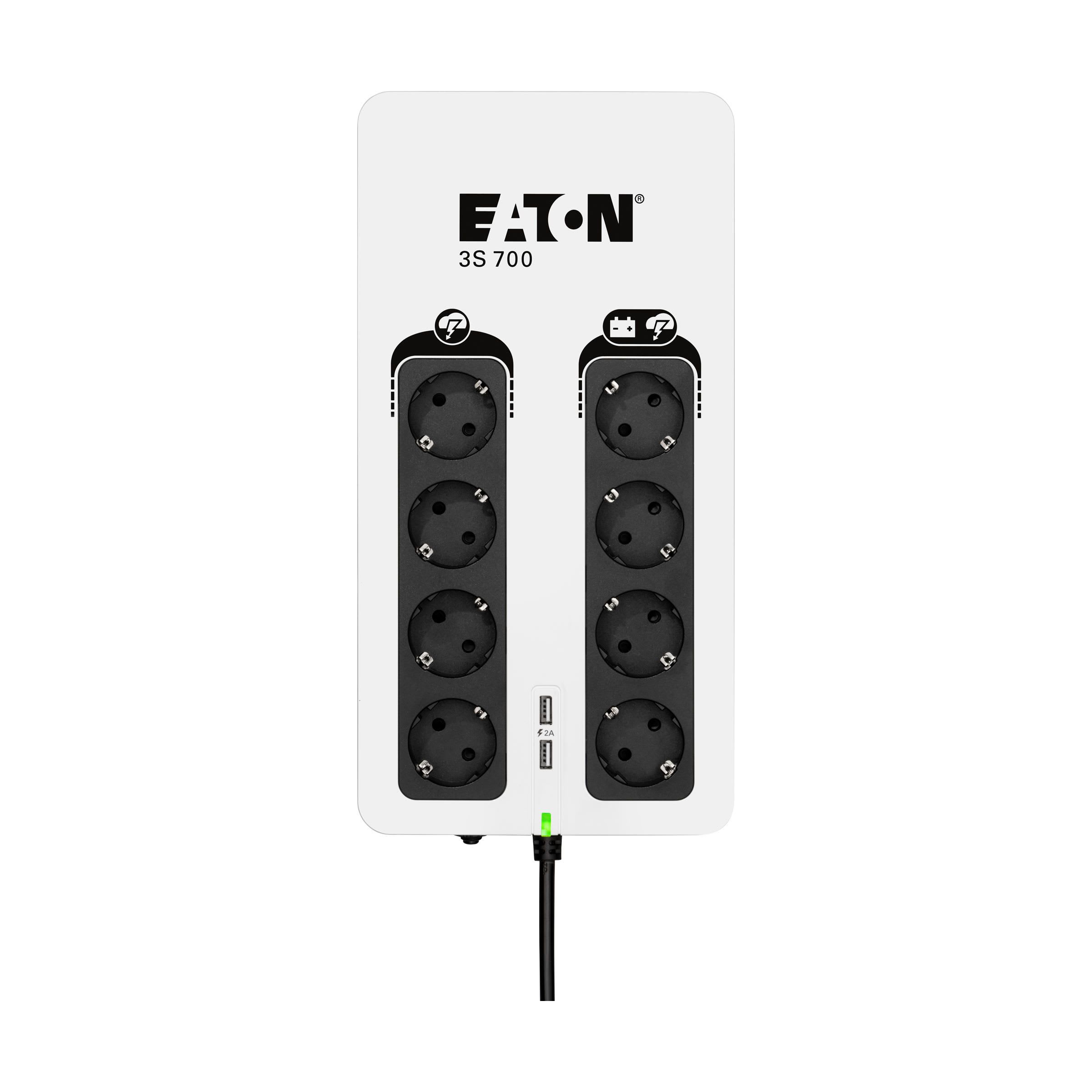 Eaton 3S 450-850 VAEaton 3S est la 2eme génération de combiné onduleur – multiprise – parafoudre.Avec son design moderne, ces 6 ou 8 prises parafoudres, ces 2 chargeurs USB, c’est toute l’expertise Eaton ,leader mondial de l’onduleur, condensée en seul produit pour la protection des applications domestiques (box, NAS, consoles) et bureautiques (poste de travail).