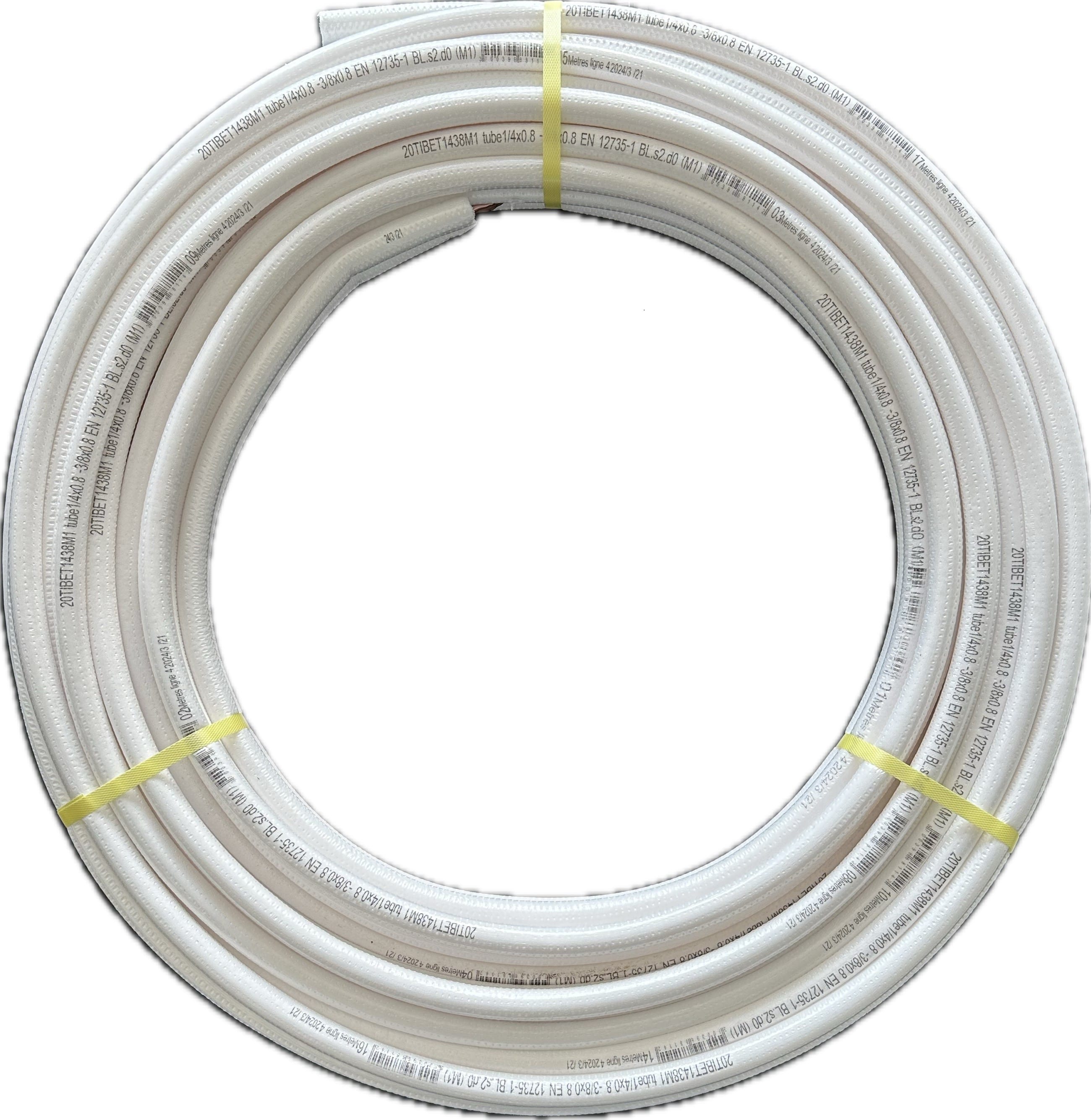 Couronne cuivre 08-1mm 1/4-5/8 isolé PE extrudé Bls1d0(M1) extrudé blanc 10m. Liaison frigorifique pour la climatisation/PAC, fabriquée en France.