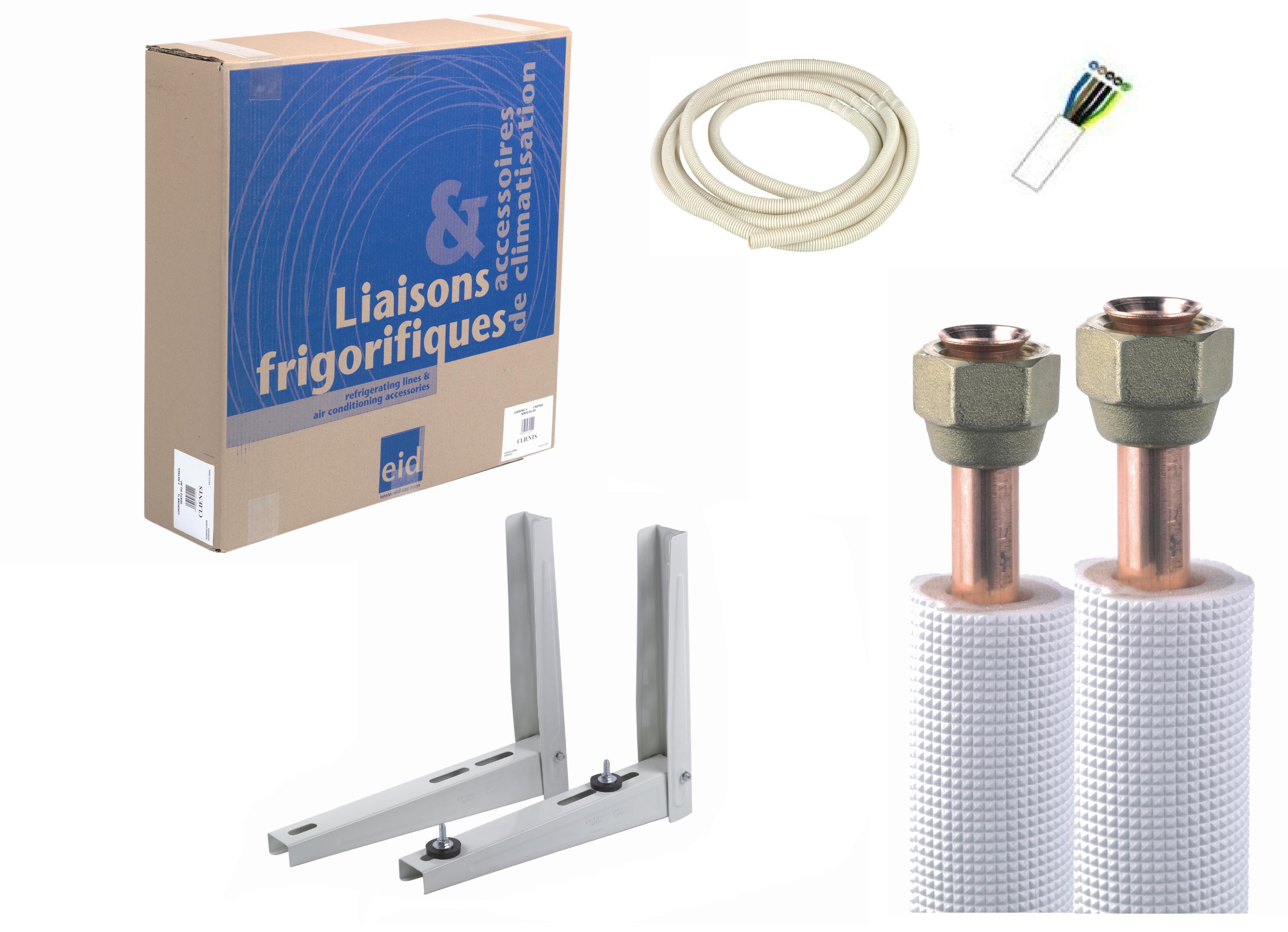 Pack complet, avec la liaison bi-tubes cuivre isolés, un support mural AS425L*70kg en acier galva epoxy et le câble élec RO2V 5*1,5mm2 d'1 m de plus que la lg de la liaison et un tube cond. de la même lg que la liaison. Fabriqué en France !