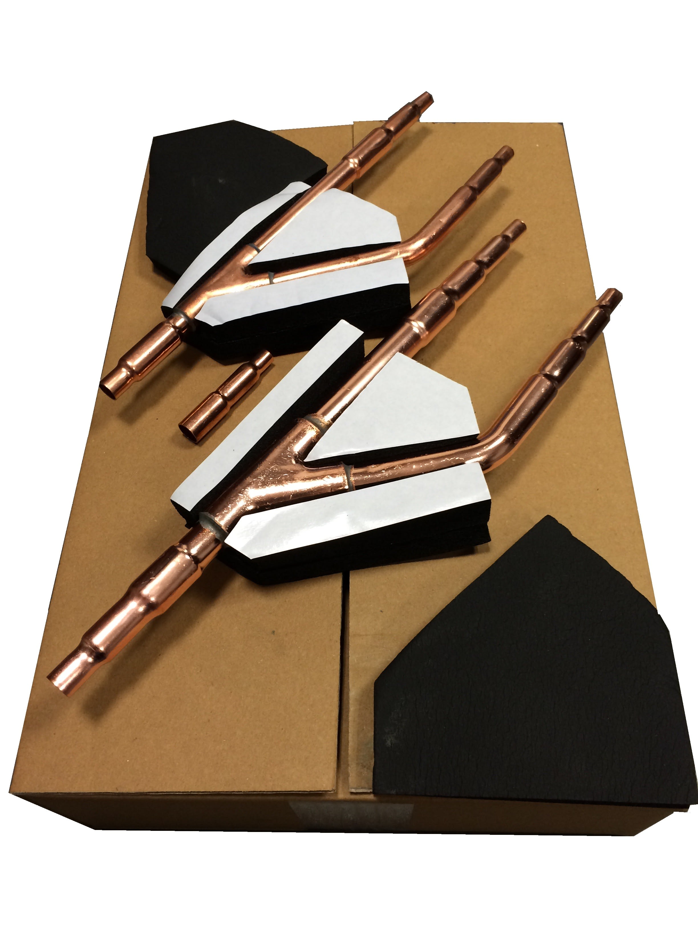 Couple de raccords de distribution REFNET® pour les DRV. Gain de temps grâce aux entrées (e) et sorties (s et d) femelles à braser multi-diamètres. Livré avec coques isolanTés Bl-s3-d0 (M1).