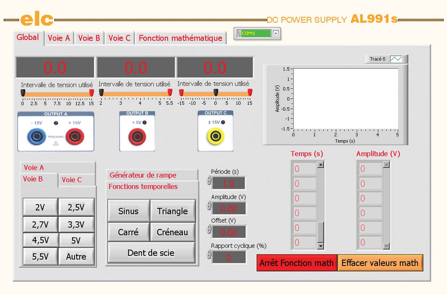 Alimentation linéaire stabilisée triple programmable réglable 0-30V ou (0 ±15V)/1A, 2 à 5,5V/3A, -15 à +15V/200mA option : USB avec accessoire USBRS232
