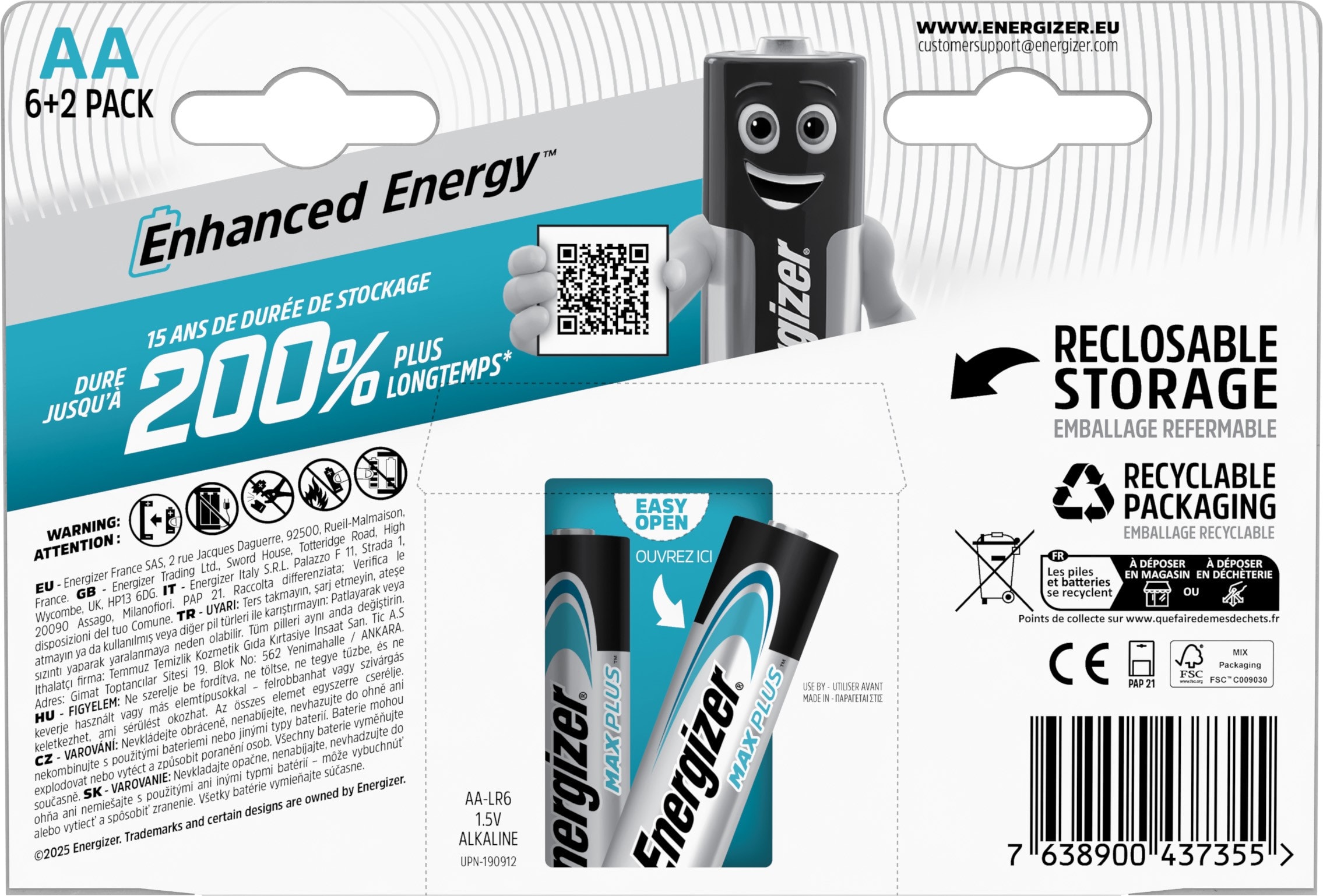 Piles alcaline Max Plus Energizer AA/LR06 blister de 6+2 conservent leur énergie pendant 12 ans dans leur emballage pour un usage quotidien fiable et performant de vos appareils énergivores