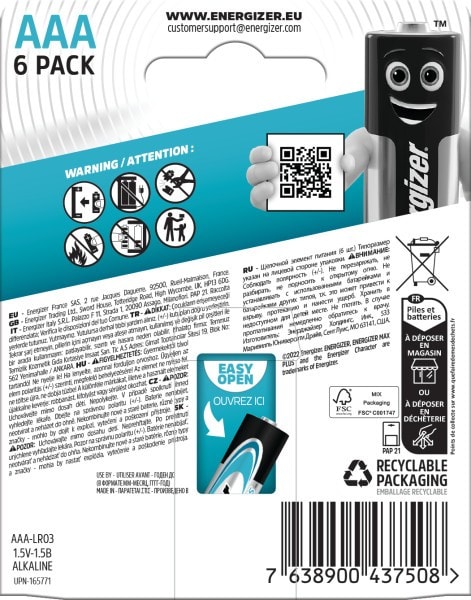 Pack de 6 piles alcalines AAA Energizer Max PlusLa plus longue durée de vie : la pile alcaline n° 1 la plus durable d'Energizer qui garde vos appareils indispensables énergisésUne énergie fiable : pour vos appareils les plus sollicités, comme les télécommandes, les horloges, les appareils photo et les jouetsProtection contre les fuites : piles AAA résistantes aux fuites pour protéger vos appareils contre les fuites et couvertes par la Garantie sans fuite d'EnergizerFiabilité : la pile alcaline Energizer ayant une durée de conservation allant jusqu'à 12 ans, elle est prête quand vous en avez besoinInnovation Energizer : par le fabricant de piles AA les plus durables au monde, Energizer Ultimate LithiumEmballage 100 % recyclable : L'emballage Energizer est 100 % recyclable, soutient la sylviculture responsable et ne contient aucun plastique, à l'exception des scellés de certains emballages
