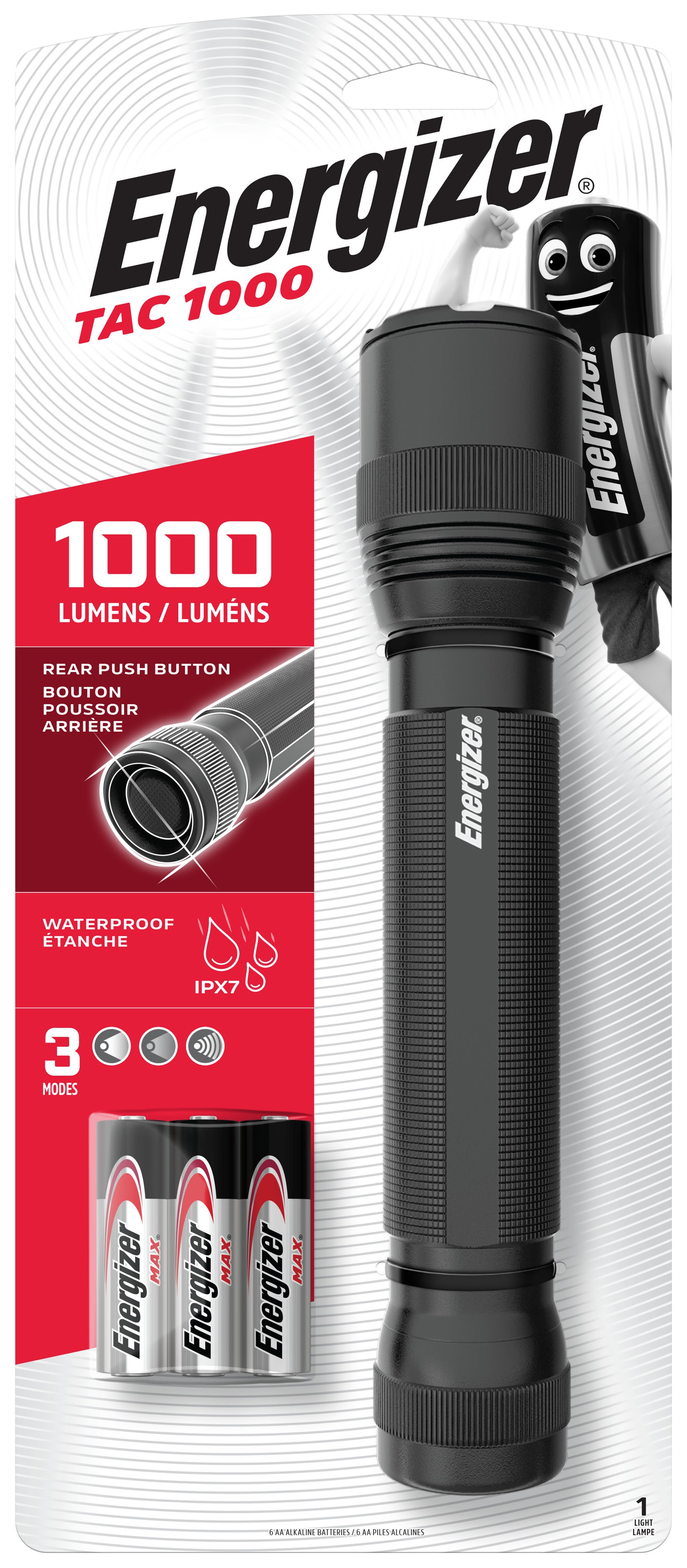 Lampe torche tactique Energizer avec 6 piles AA inclusesLampe torche super lumineuse : Cette lampe torche LED de 1000 lumens offre une luminosité exceptionnelle et des performances élevées, vous permettant de voir jusqu'à 2003 modes d'éclairage Élevé pour une luminosité maximale, économiseur d'énergie pour optimiser le temps d'exécution et mode stroboscopique pour une utilisation d'urgenceConstruction durable : cette lampe torche étanche robuste et durable est dotée de la technologie IPX7, qui permet une immersion sous l'eau de 1 mètre pendant jusqu'à 30 minutesHeures d'autonomie : Heures d'autonomie : la lampe torche LED Energizer peut briller jusqu'à 15 heures en mode basLégère : Gardez cette lampe torche puissante, polyvalente et fine dans votre tiroir, votre voiture, votre trousse d'urgence à domicile ou transportez-la dans votre sac.Très polyvalente : Cette torche compacte et facile à utiliser vous protège à la fois pour une utilisation d'urgence et quotidienne