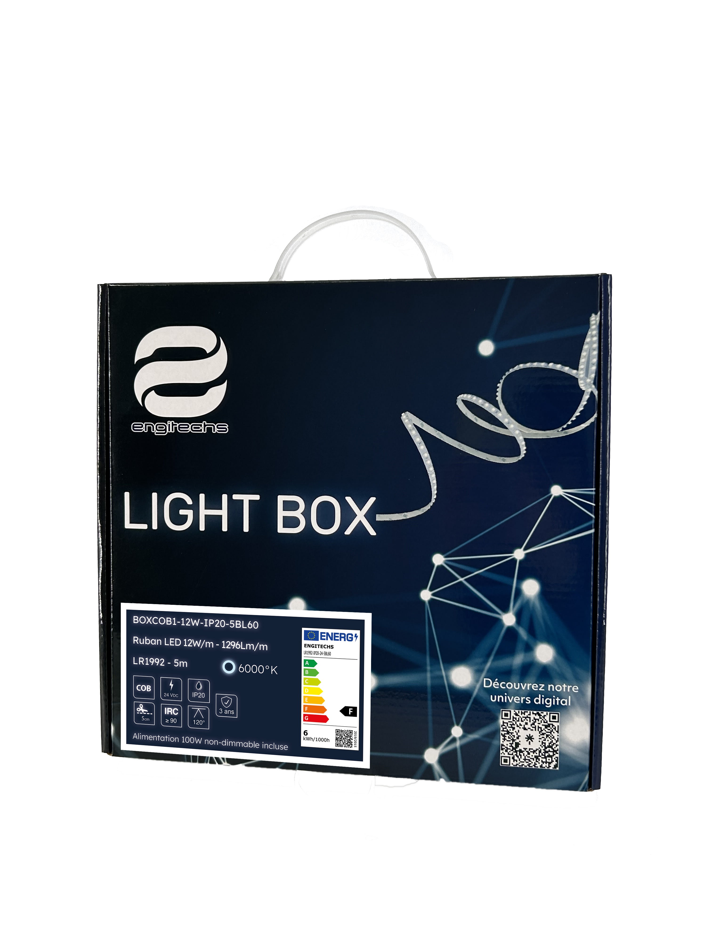 Notre LIGHT BOX BOXCOB1-12W-IP20-5BL60, est équipée d'un ruban COB de 5 mètres d'une puissance de 12W/m, et d'une alimentation dimensionnée en fonction de ce ruban. Avec un indice de protection IP20, elle est adaptée à vos espaces intérieurs. Sa température de couleur de 6000°K permet de créer une ambiance lumineuse claire et énergisante, convenant aux espaces nécessitant une forte luminosité.