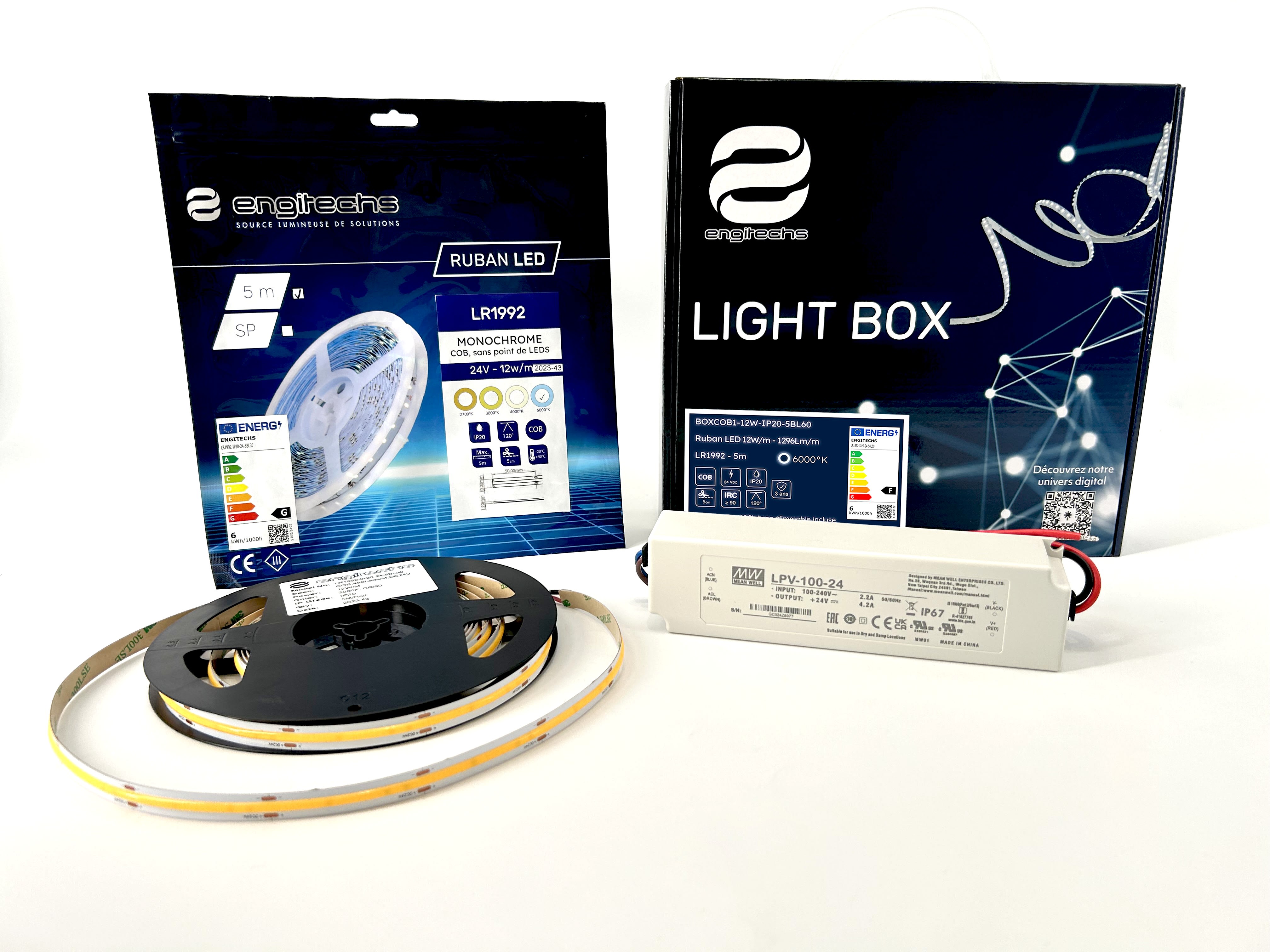 LIGHT BOX COMPOSE D'UN COMPOSE D'UN RUBAN LED COB 12W/M IP20 BOBINE DE 5M 6000K AVEC ALIMENTATION 100W 24V