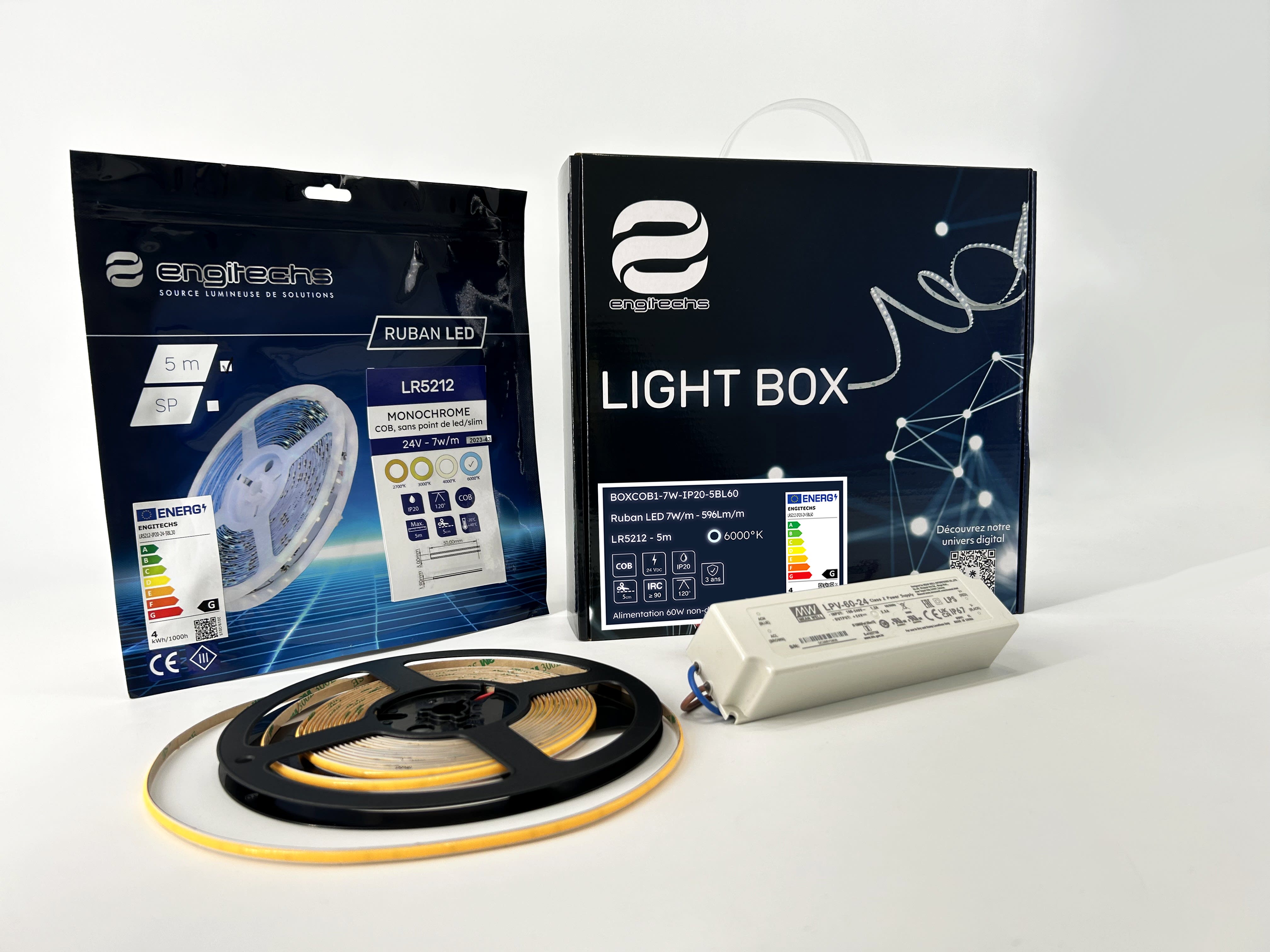 LIGHT BOX COMPOSE D'UN COMPOSE D'UN RUBAN LED COB 7W/M IP20 BOBINE DE 5M 6000K AVEC ALIMENTATION 60W 24V