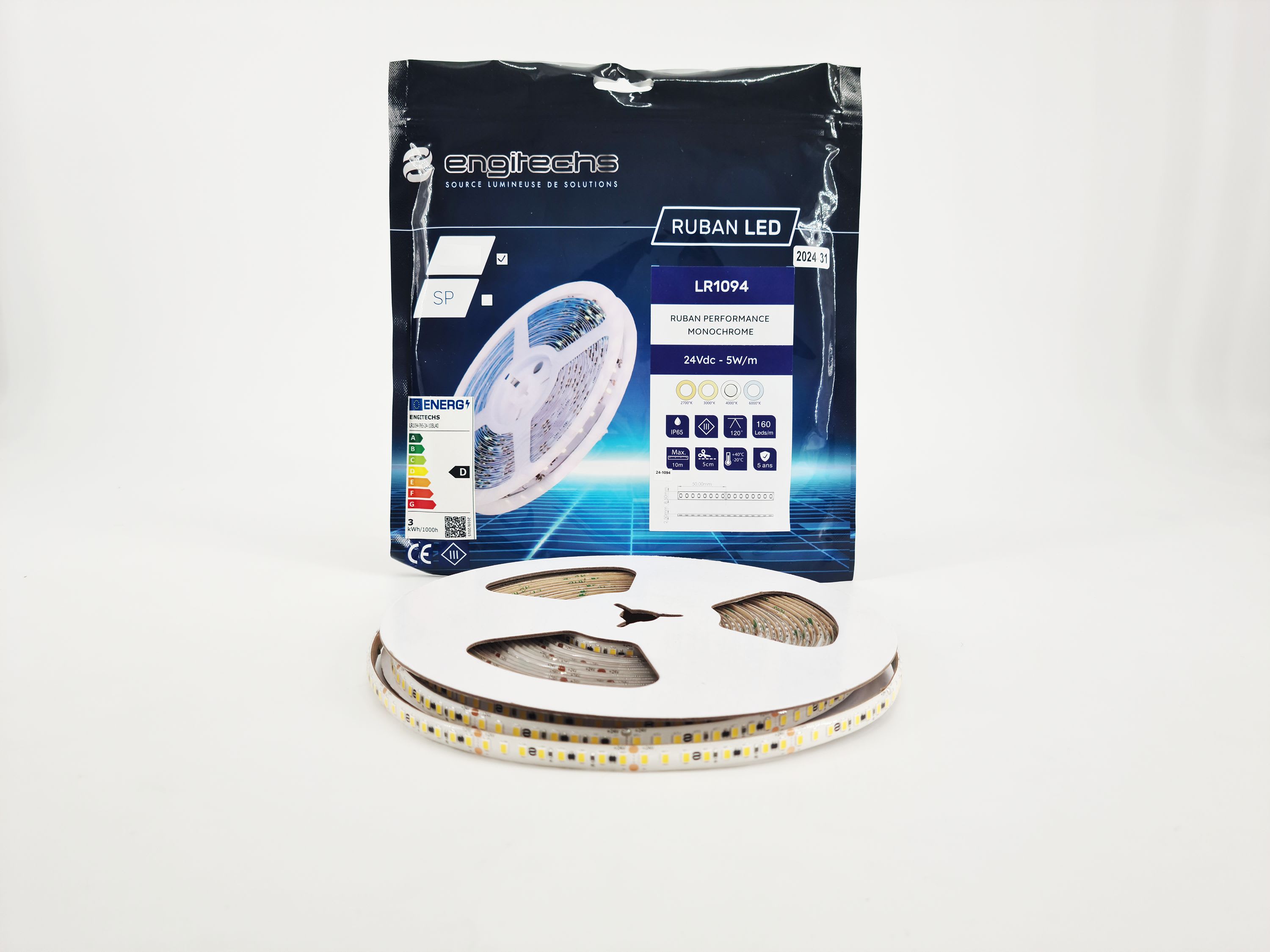 ENGITECHS - LR1094 RUBAN LED 5W, 24V, 750LM, 145LM/W, 4000K, IP65, IRC90, 5M - LR1094-IP65-24-5BL40