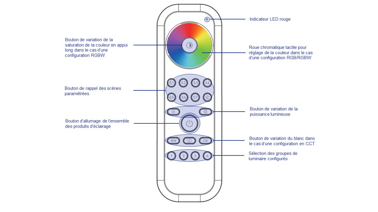 Cette télécommande vous permettra de contrôler et faire varier la luminosité et la teinte/couleur de votre éclairage.Bon à savoir : Ce produit utilise le protocole sans fil ZIGBEE et reste compatible avec d’autres modules utilisant ce même langage de communication.