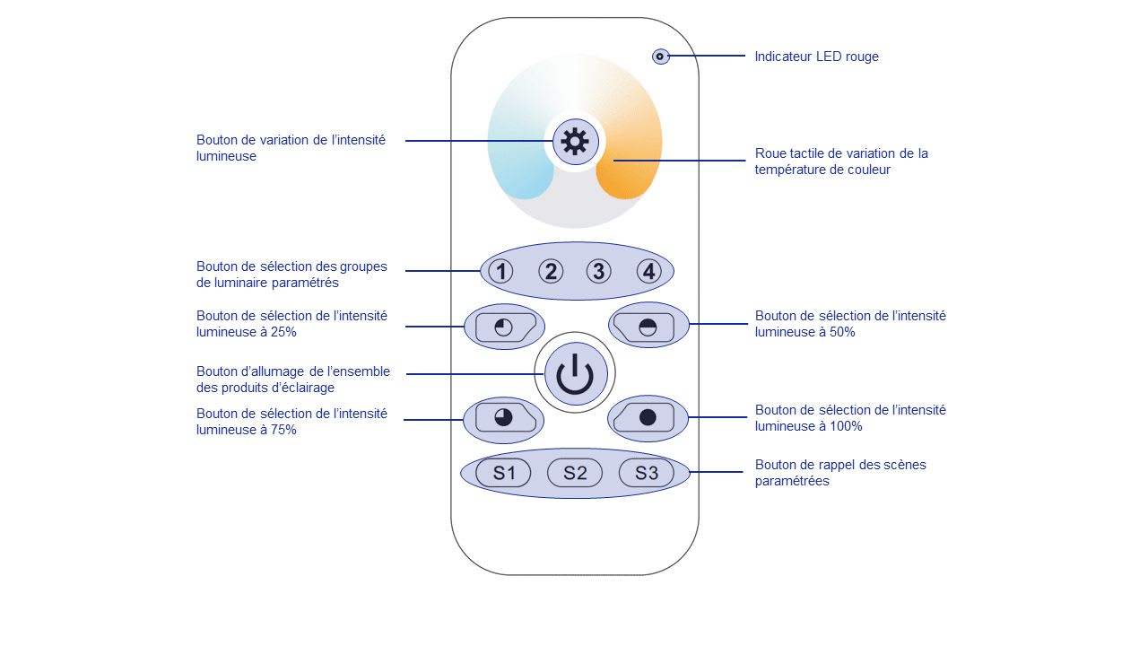 LR2456 TELECOMMANDE DE COULEUR NOIRE POUR RUBAN LED CCT EN ZIGBEE AVEC UNE ROUE CHROMIQUE 30M DE CHAMPS LIBRE 4 ZONES / 3 SCENES
