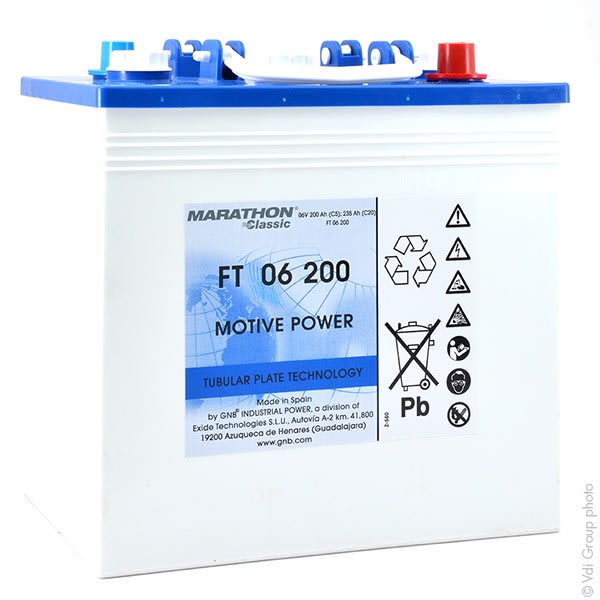 Vendu par Batterie(s) Gamme Monoblocs FT Plomb ouvert plaques tubulaires Capacité en C5 : 200Ah Capacité en C20 : 235Ah Equivalent avec MARATHON CLASSIC FT 06 200, NBA POWER PLUS, DYNO 6PZS180, ENERSYS 6 TP 175, GNB FT06200, GNB FT 06 200, EXIDE FT06200, EXIDE FT 06 200, ENERSYS 6TP175, MARATHON CLASSIC FT06200