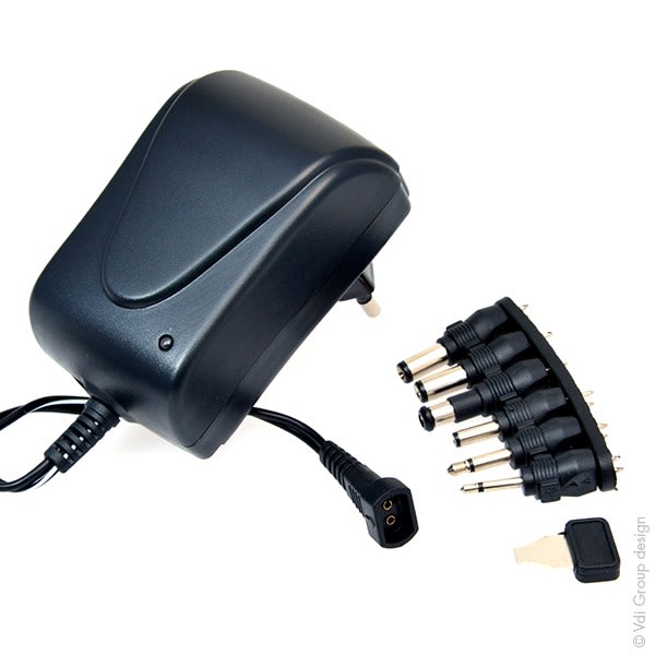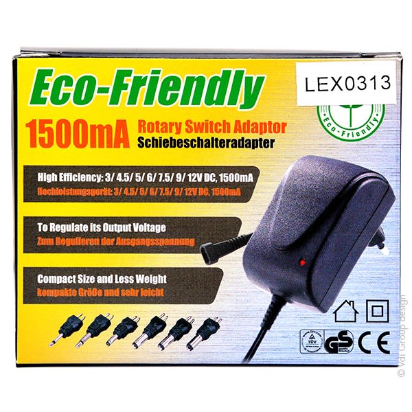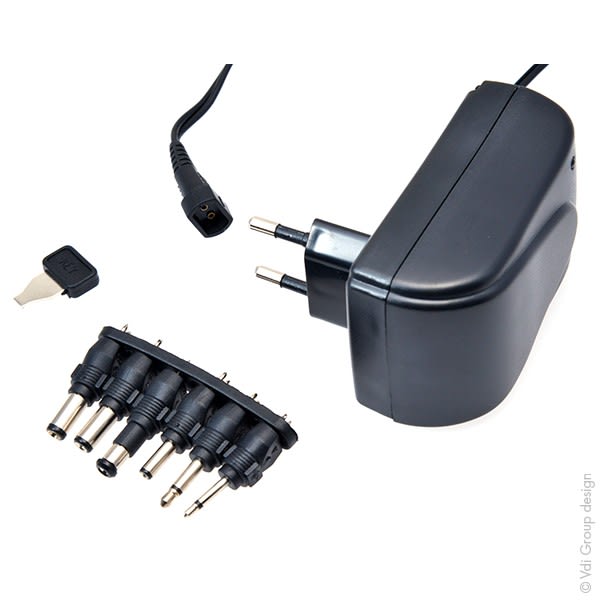 Vendu par Unité(s) Alimentation livrée avec jeu de 6 connecteurs détachables (voir fiche technique pour la photo de chaque connecteur) : G= dimensions 5.5×2.5×(12±0.5)mm N= dimensions 5.5×1.5×(12±0.5)mm D= dimensions 5.0×2.1×(12±0.5)mm H= dimensions 3.5×1.35×(10±0.5)mm B= dimensions3.5×(15±0.5)mm A= dimensions 2.5×(12±0.5)mm Tensions d'entrée : 100 / 240V Tensions de sortie : 3V/ 4,5V/ 5V/ 6V/ 7,5V/ 9V/ 12V à 1500mA Equivalent avec LEX5119, CEP5164