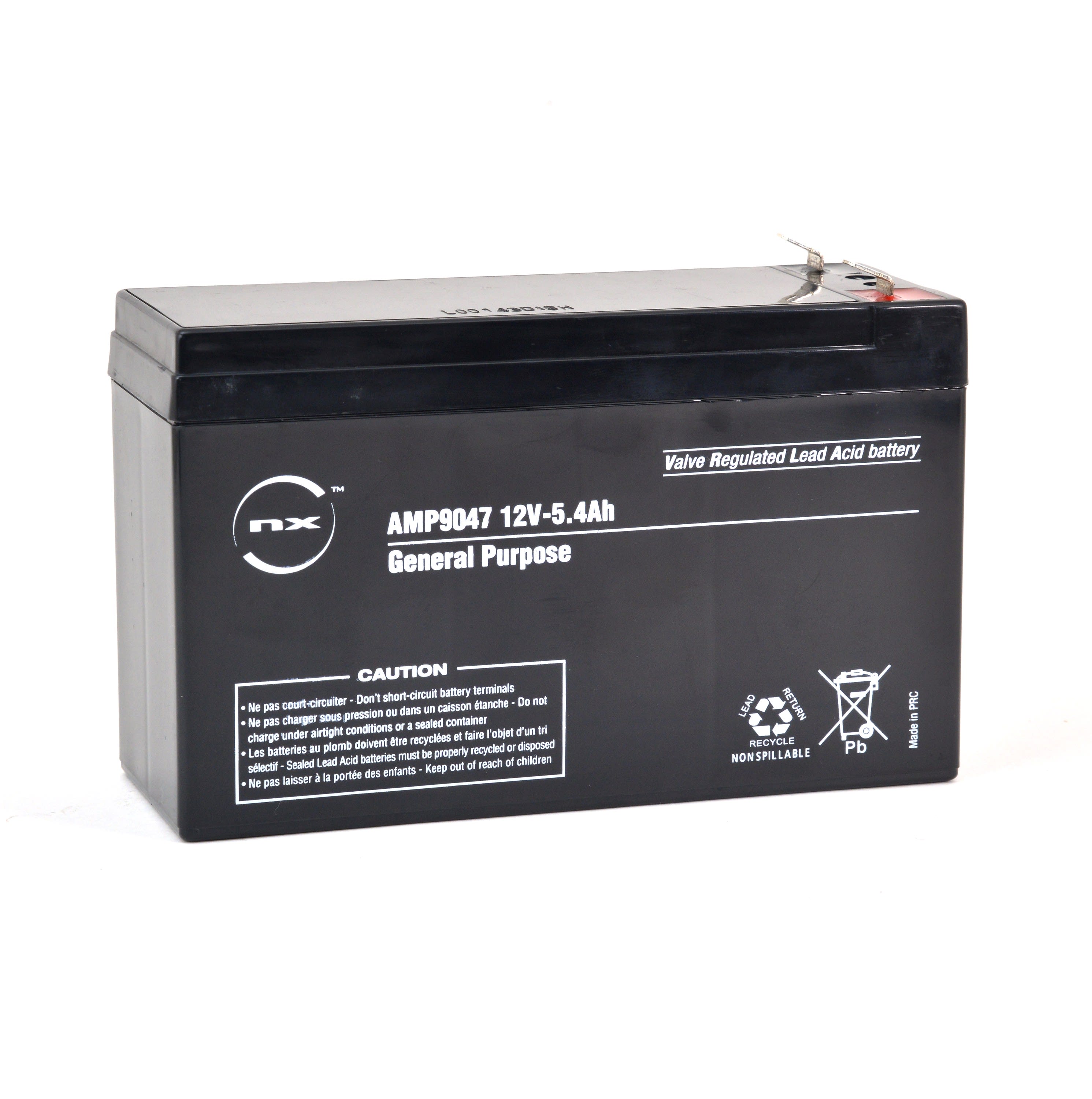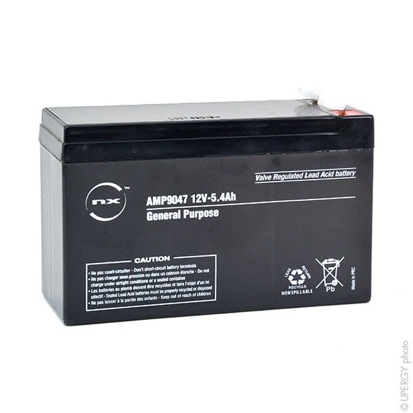 Vendu par Unité(s) La batterie 5.4-12 General Purpose de la marque NX est une batterie plomb étanche AGM sans entretien qui offre d'excellentes performances pour un usage en charge permanente (floating). Sa qualité de fabrication avec ses séparateurs AGM haut de gamme lui procure une très grande fiabilité et importante durée de vie. Cette batterie répond en tous points aux exigences des plus grands fabricants. La batterie 5.4-12 General Purpose peut également être utilisée pour réaliser du cyclage à courant faible de manière non intensive. Pour du cyclage intensif, nous vous conseillons la gamme NX Cyclic. Caractéristiques de la batterie NX 5.4-12 General Purpose = - Capacité nominale 12V 5.4Ah/C20 - Connectique F4.8 = Faston 4.8mm - Bac Non FR = UL94 HB (Standard ABS) Avantages de la gamme NX General Purpose = - Batterie plomb étanche AGM pour usage général - Durée de vie en charge permanente (floating) : jusqu'à 5 ans (à 20°C) - Grilles plomb-calcium pour une faible auto décharge et durée de vie améliorée. - Fonctionnement dans n'importe quel sens (sauf une utilisation inversée continue) Cette batterie 5.4-12 General Purpose est idéale pour les applications suivantes = - Tout usage - Stockage d'énergie - Alarme et sécurité - Appareils et équipements électroniques - Alimentation de secours - Eclairage de secours - Petit onduleur - Signalisation ferroviaire ou d'avion Equivalent avec HR 1224W, UPS123606, SW200, UP-RWA1232P2, HR1224W F1, HR1224W