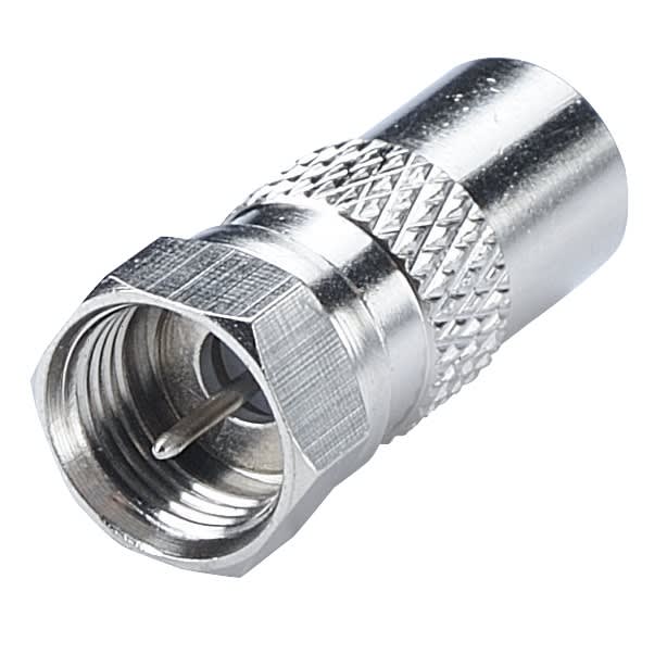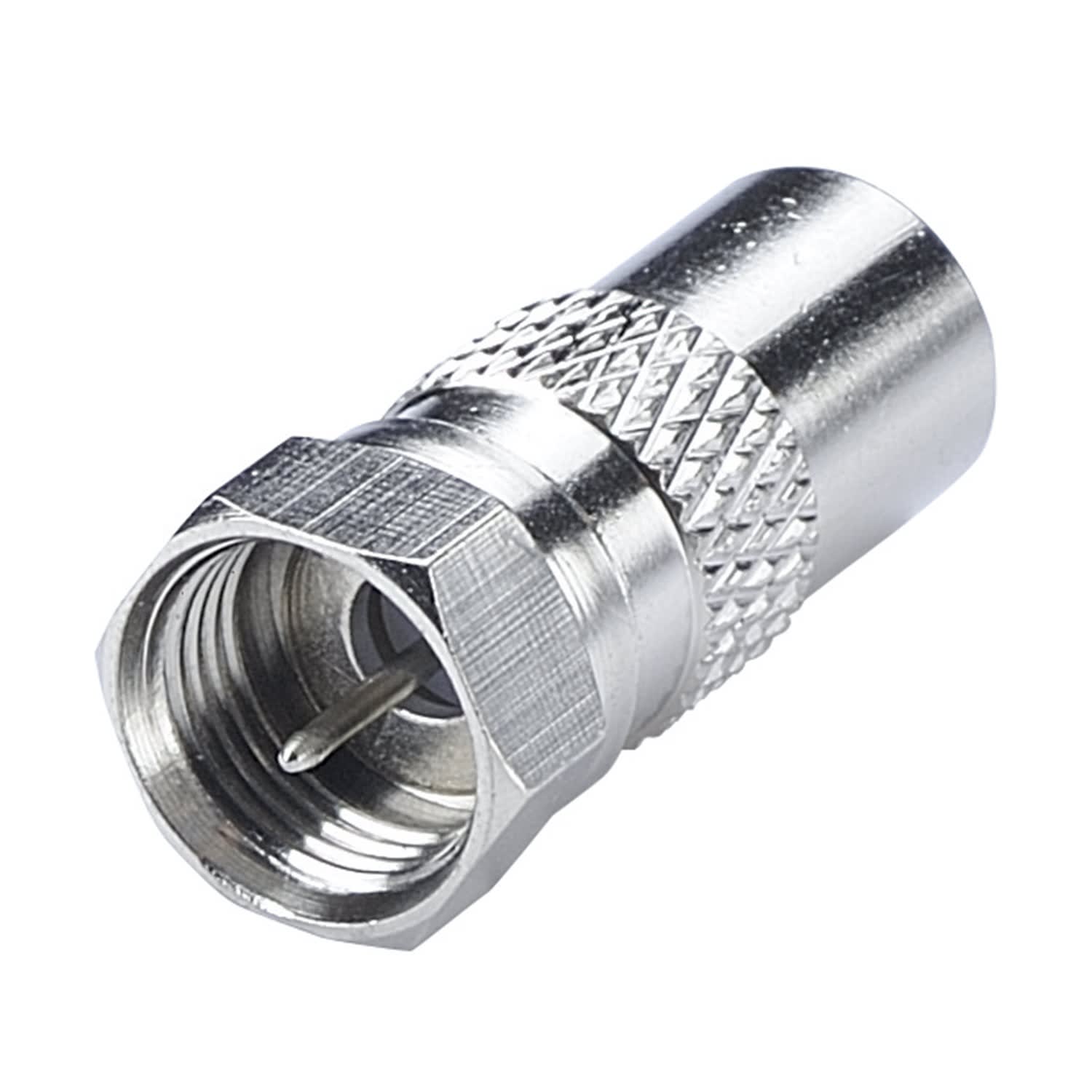 Adaptateur F mâle / TV 9.52 mm mâle - Connecteurs plaqués nickel - Permet de raccorder un cordon ou un équipement avec une fiche F femelle à un autre muni d'une fiche TV 9,52mm femelle