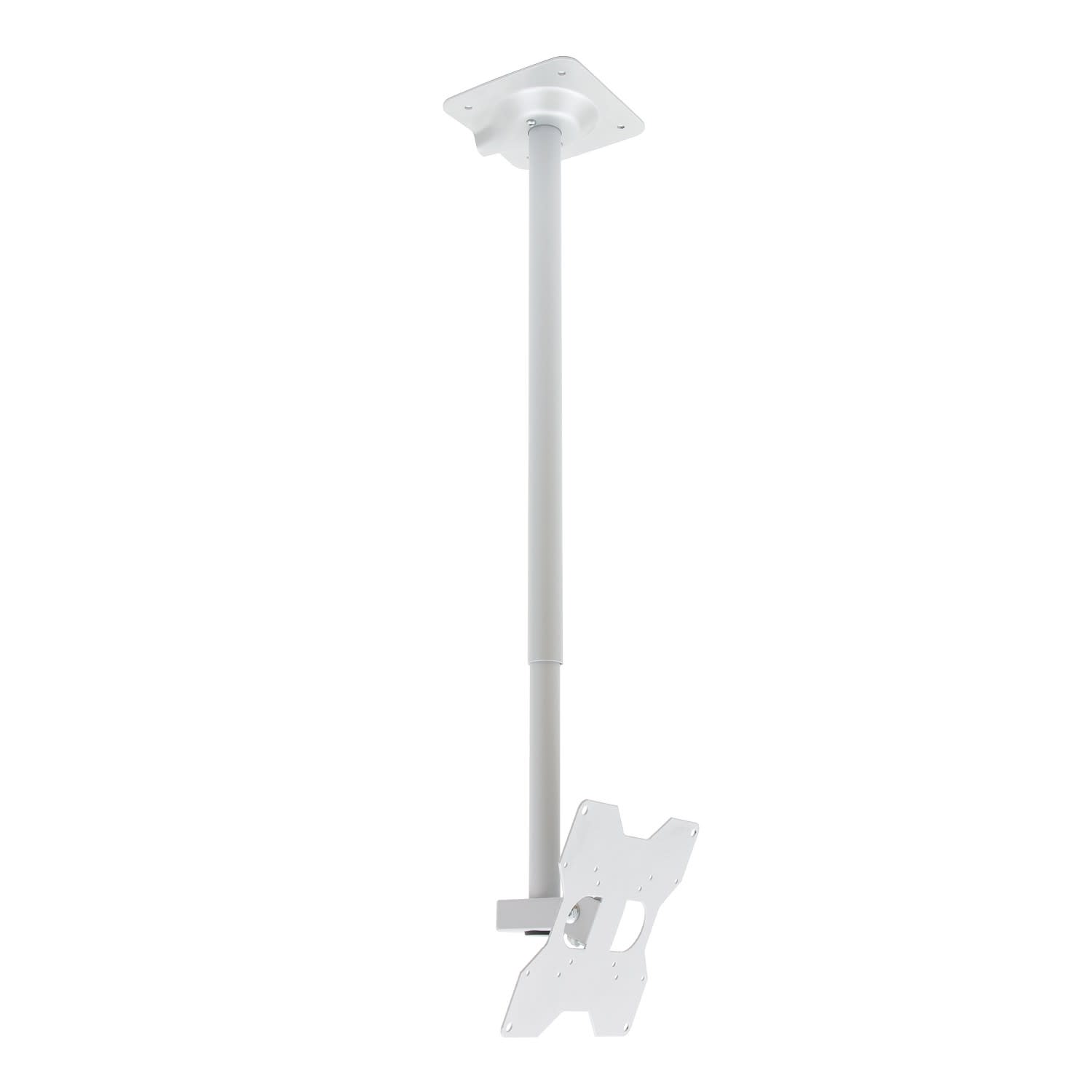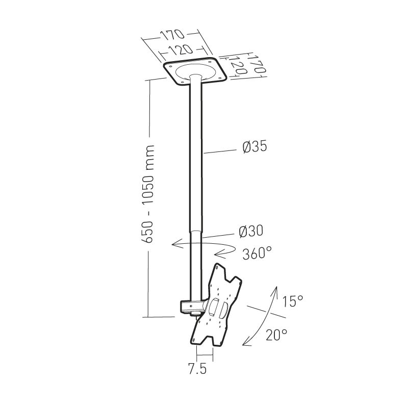 • Platine plafond, potence et support écran, en acier.• Peinture époxy poudre.• Réglages de l'inclinaison et de l'orientation.• Blocages avec clé spécifique fournie.• Longueur de la potence ajustable.