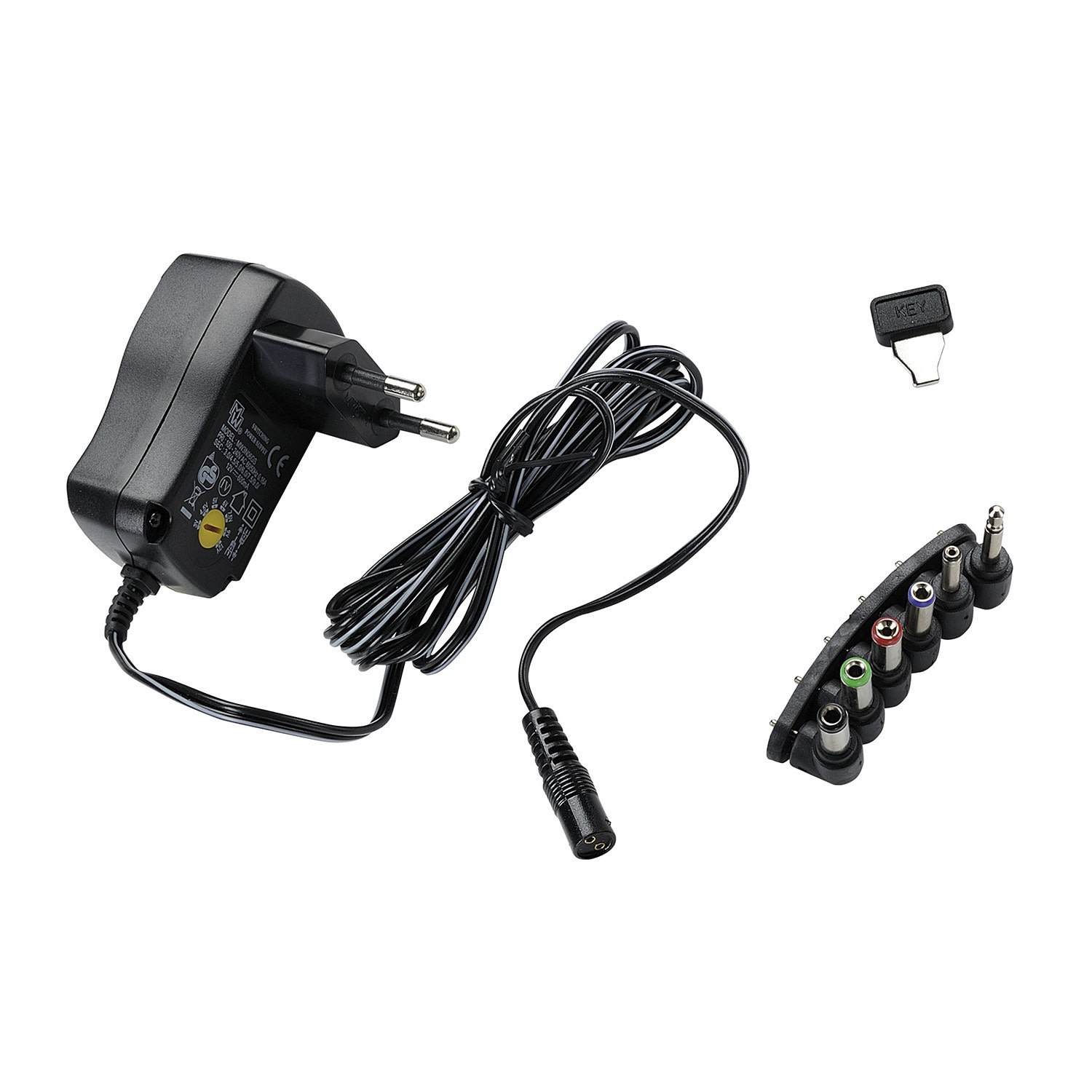 Bloc d'alimentation 250V/1A - Sortie tension continue réglable + 6 adaptateurs de sortie - puissance maximale 12W - polarité réversible - voyant lumineux de mise sous tension