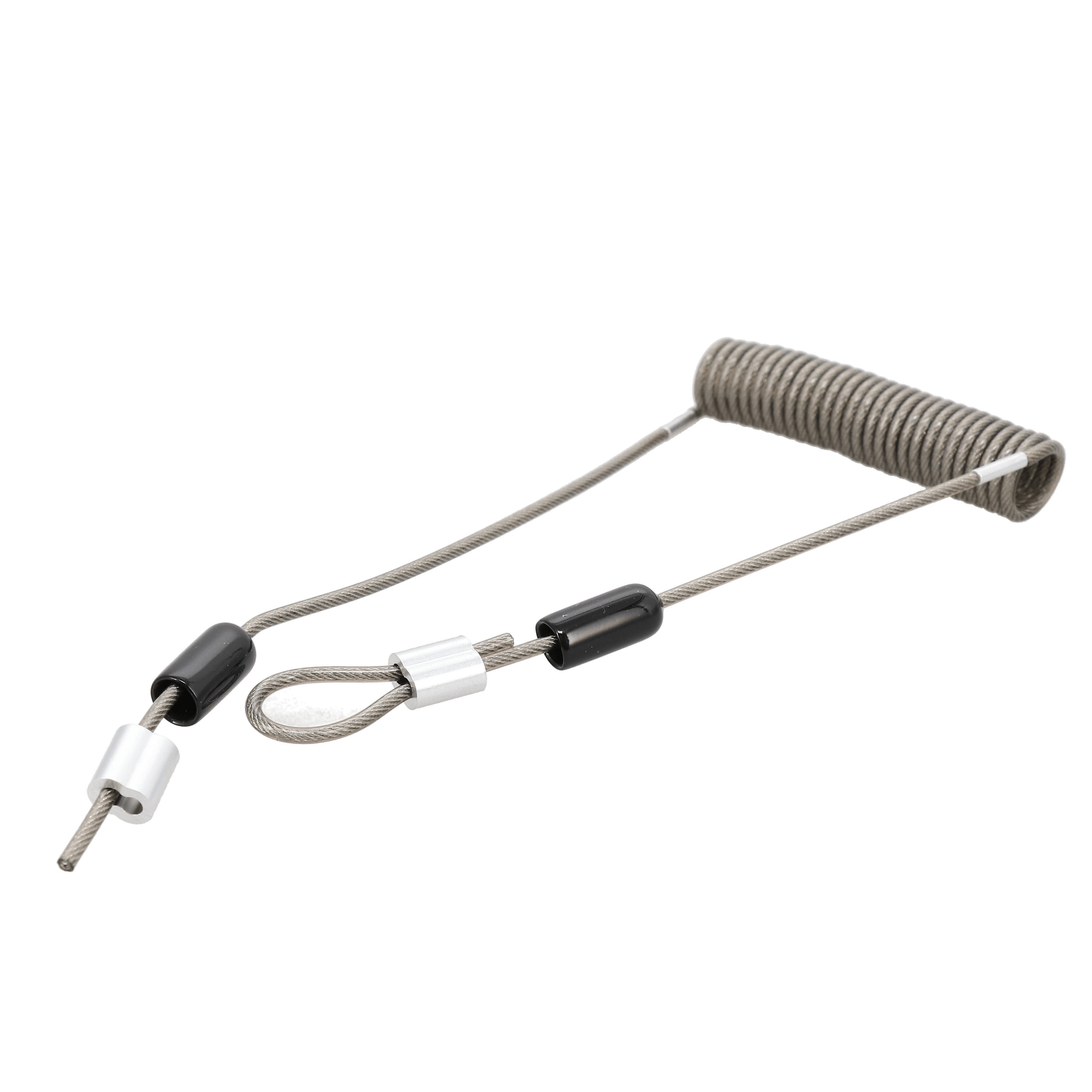• Câble acier spiralé plastifié • 2 bagues de sertissage • 2 capuchons noir de protection • Longueur étirée : 1,50 m • Notice fournie