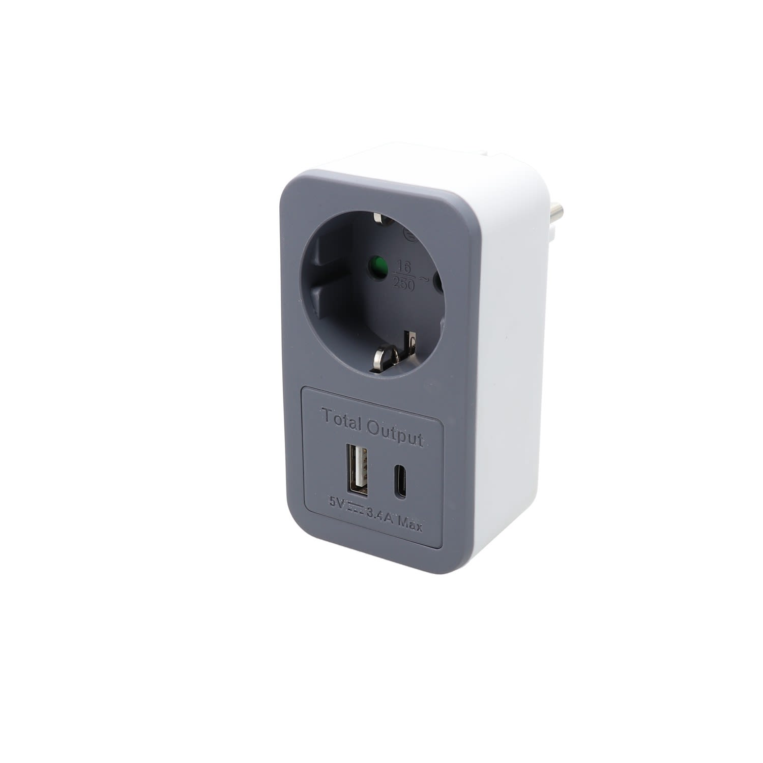 Chargeur 2P+T gigogne + 1 USB A + 1 USB C - tension d'entrée 230V 16A - puissance maximale 3680W - interrupteur lumineux - protection enfants
