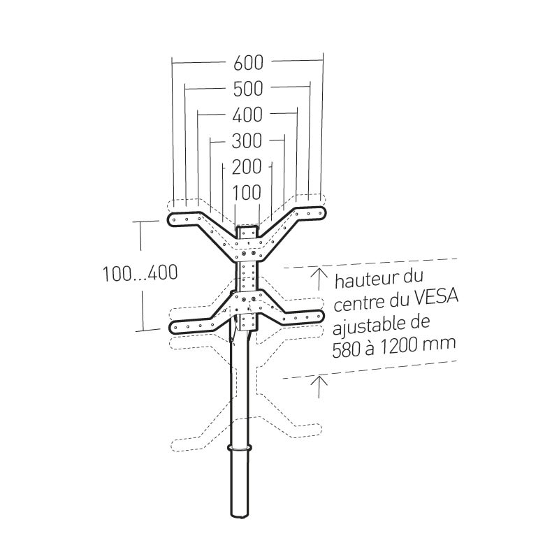 • Ecran réglable en hauteur sur 620 mm.• Gestion des câbles dans la colonne.• Support écran inclinable et orientable.• En acier, peinture époxy noire.• Tête réversible offrant une grande latitude de réglage de la hauteur.• Compatible avec tous les modèles NAGA.