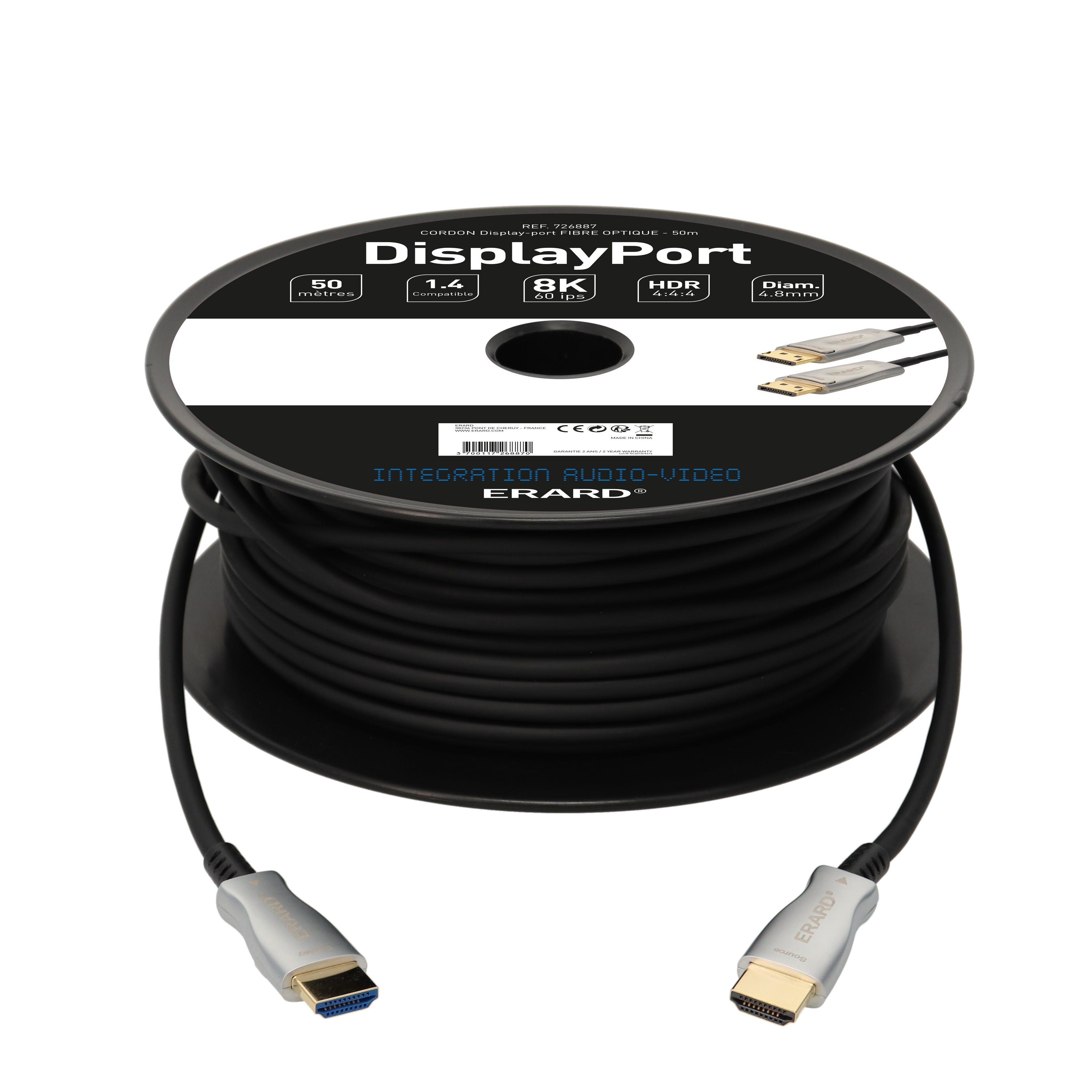 AOC (active optical cable) : technologie hybride mêlant cuivre (pour les fonctionnalités de type alimentation, CEC, ...) et fibre optique multimode (pour le transfert des flux audio et vidéo). Les prises sont équipées de circuits imprimés qui convertissent le signal.Permet de connecter une source de lecture HDMI à un écran TV ou un vidéo-projecteur grâce aux cordons HDMI grandes longueurs en résolution 4K qui utilise la technologie Fibre Optique.
