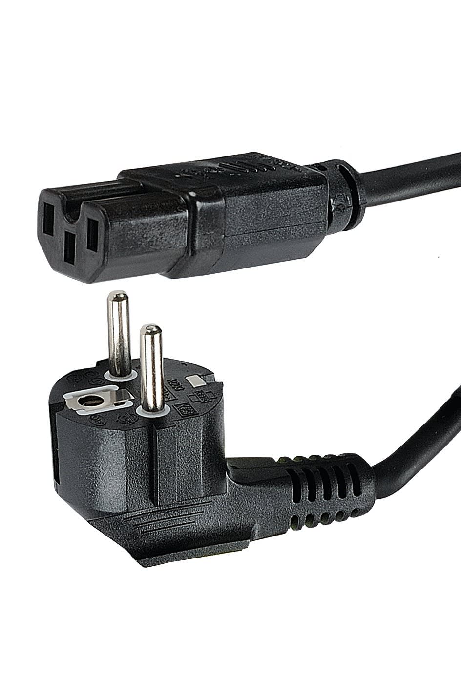 Cordon élec d'alimentation 2m - 1 fiche (2 P+T) mâle / prise IEC C15 femelle - Prise coudée à 90° - gaine bakélite haute température - pour appareils chauffants - Section : 3 x 1 mm² - 16A - Puissance maximale : 3680W - noire