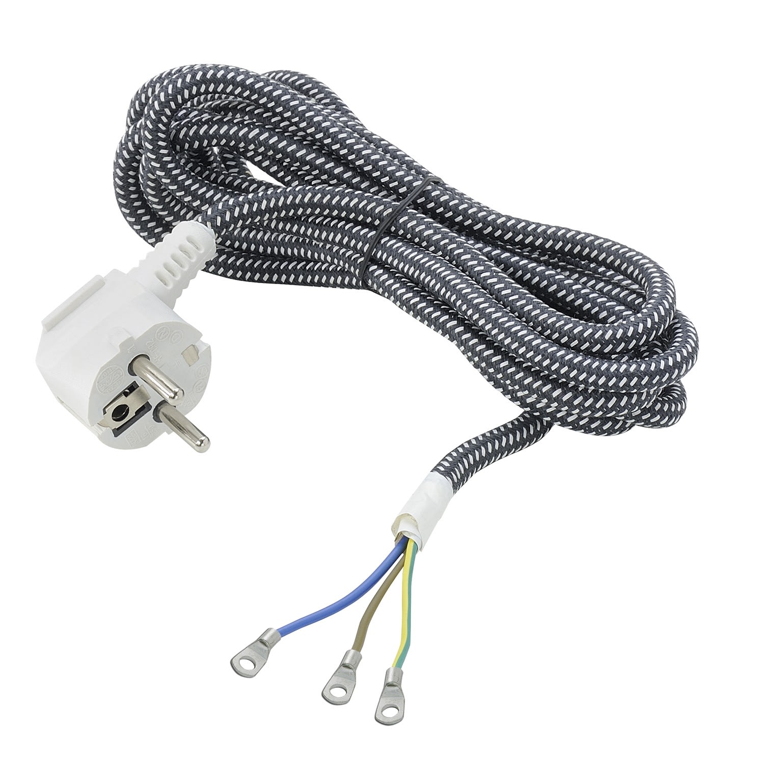 Cordon élec d'alimentation 3m - 1 fiche (2 P + T) mâle - Prise coudée à 90° / 3 fils avec cosse cuivre OFC - pour fer à repasser - Section : 3 x 1 mm² - 16A - Puissance maximale : 3680W - gaine tressée