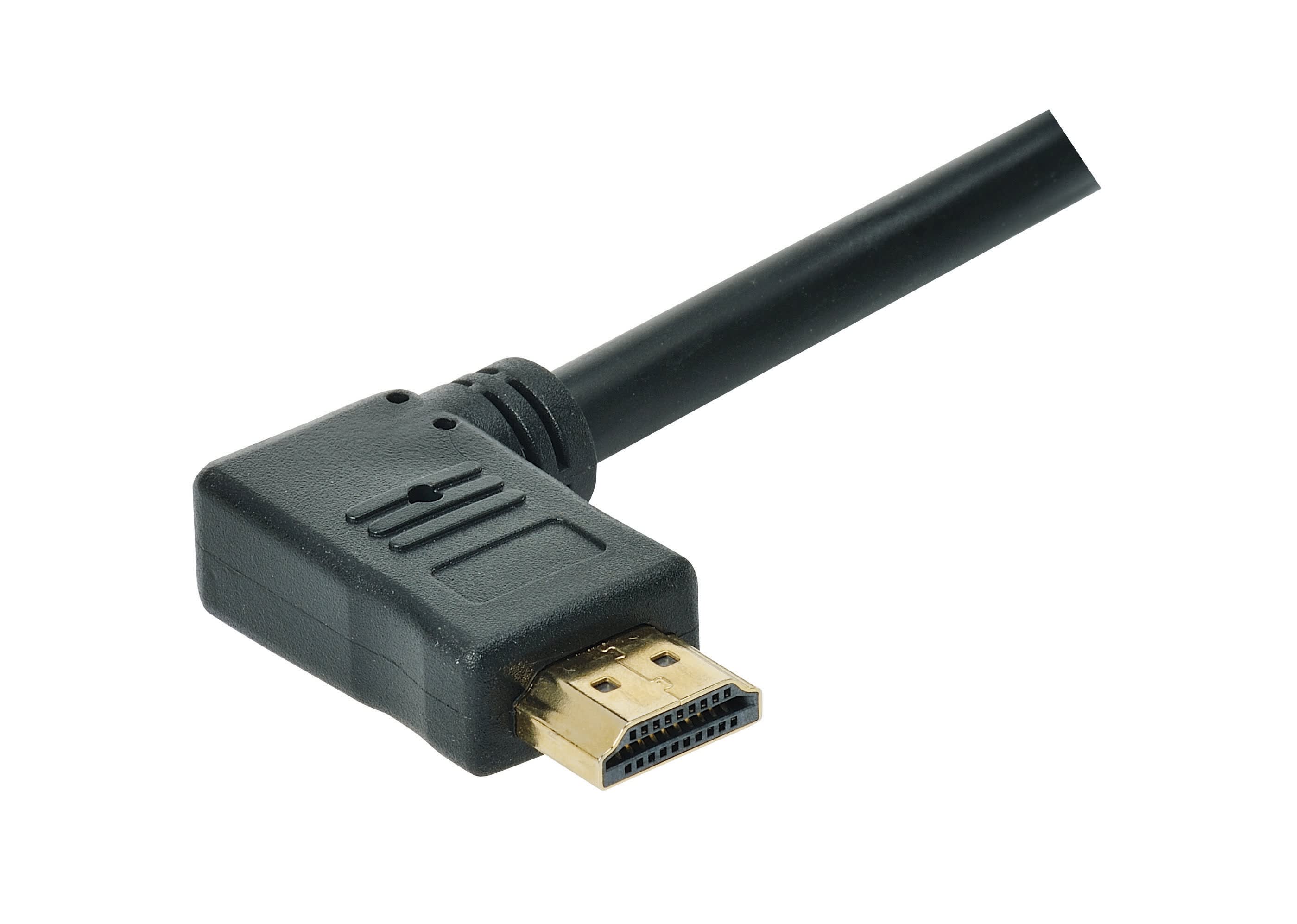 Cordon HDMI A mâle / HDMI A mâle coudé latéral à 90° - 2m - 4K/60ips HDR 4:4:4 - Bande passante 18 gbps - gaine pvc noir - high speed with ethernet - Connecteurs plaqués OR cuivre OFC - 19 pins connectées blindage renforcé