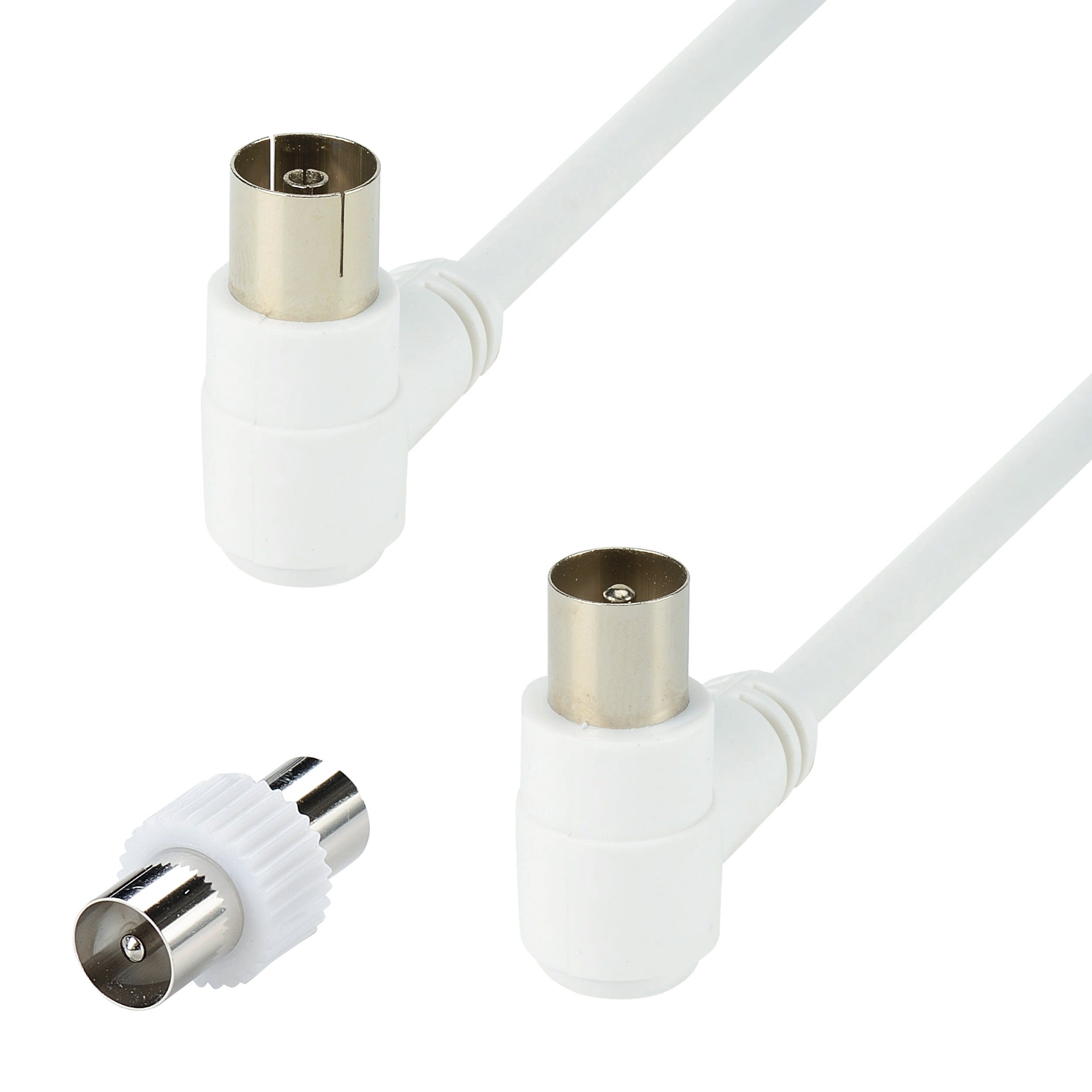 Cordon TV - 5m - 9.52 mm mâle / femelle coudé à 90° + adaptateur TV 9.52 mm mâle / mâle - Impédance : 75 Ohms - Connecteurs plaqués nickel.