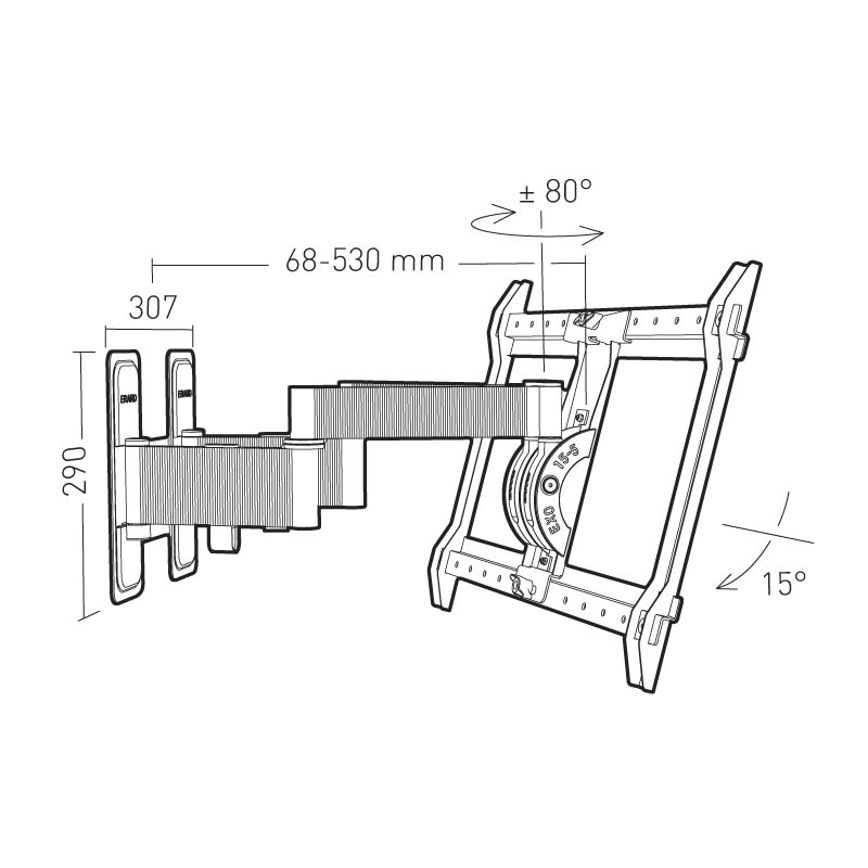 EXOXXLTW3 -support mural aluminium inclinable de +/-15° et orientable de +/- 160°. 2x2 bras - Déport 530 mm - pour écran de 40'' à 100'', vesa 200 à 600x400. Poids maximum supporté 70 kg.