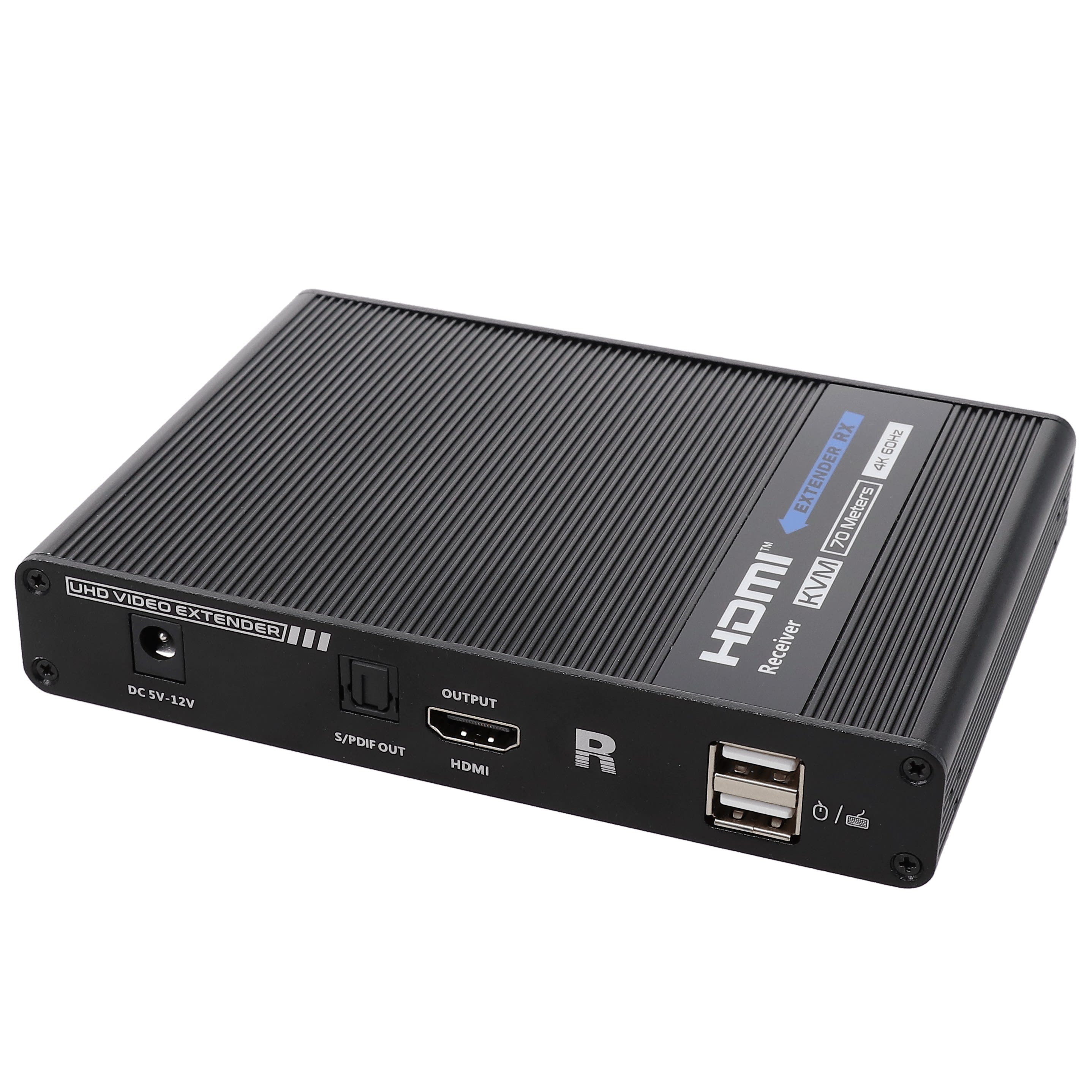 • Plug and play• ÉmetteurEntrée : 1 HDMI A1 USBA 2.0Sortie : 1 RJ451 HDMI A (Bypass)• RécepteurEntrée : 1 RJ45Sortie : 1 HDMI A2 USBA 2.01 Toslink S/PDIF (Audio numérique)• Distance maximale de transmission du signal : 70 men point à point• Résolution maximale : 4K60Hz HDR 4.4.4 - 3840x2160p@60 HzBande passante : 18 Gbps• Synchronisation automatique • Fonction déport télécommande1 cordon USBA M/M (fourni)• 2 alimentations (5 V/2 A) fournies8 pattes de fixation• Boîtiers métal• Dimensions / poidsÉmetteur : 150 x 107 x 28 mm / 260 gRécepteur : 150 x 107 x 28 mm / 260 g