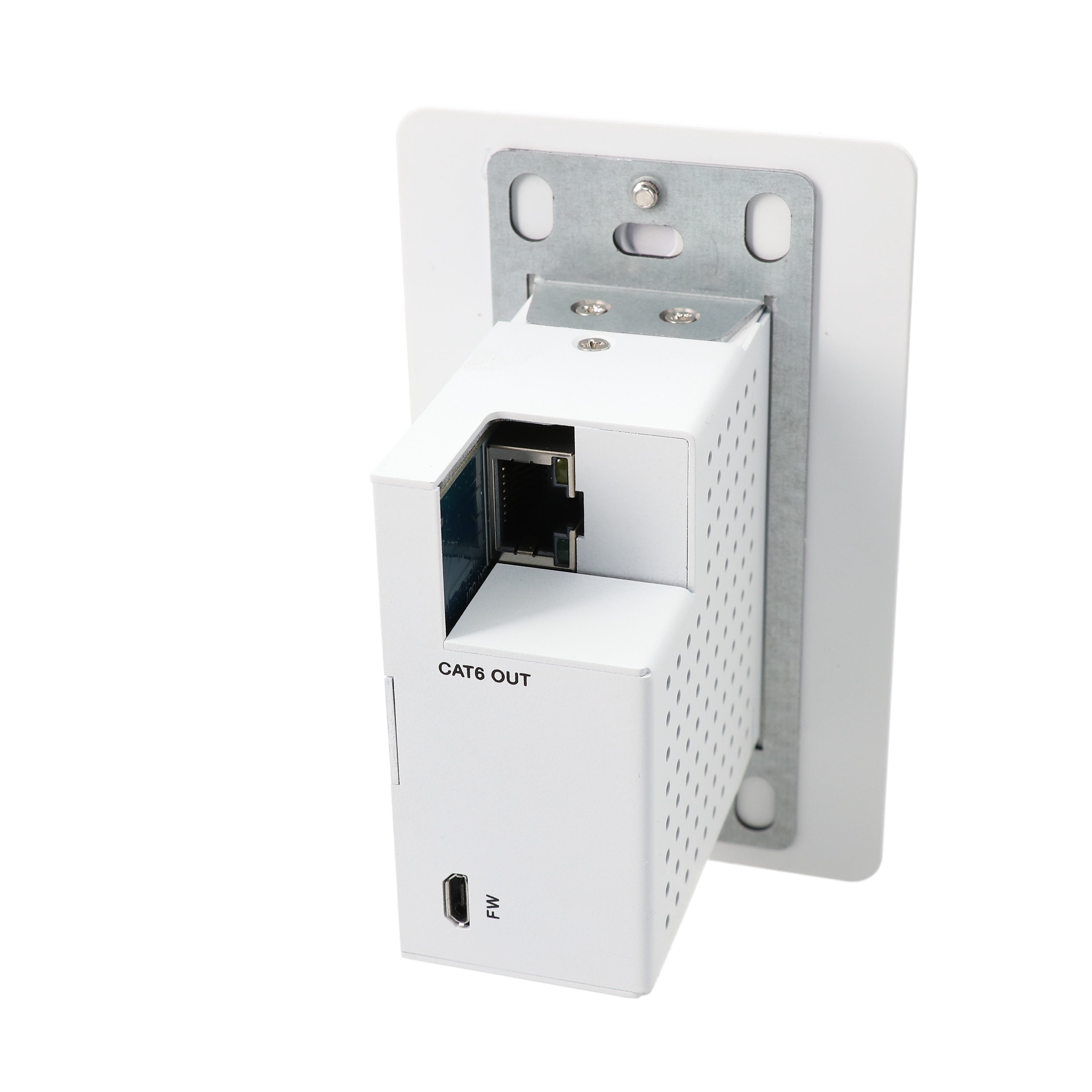 • Plug and play• ÉmetteurEntrée : 1 HDMI 1 USB C 3.2 Gen11 USB C pour chargeur (PC, tablette...)Sortie : 1 RJ45• RécepteurEntrée :1 RJ45Sortie : 1 HDMI 4K60 HDR 4:2:0• Distance maximale de transmission du signal : 35 m en 4k60 et 50 en 4K30 avec câble Cat.6 - 23 AWG• Résolution maximale : ULTRA HD 4K HDR 4:2:0 - 3840x2160p@60Hz• Bande passante : 18 GBps• Synchronisation automatique • Fonction POE Alimentation de la platine via le récepteurCâble RJ45 conseillé : 902395 - Rigide - 23 AWG• Bloc d'alimentation (12 V/1 A) fourni• Boîtiers métal• Platine de finition fournie• Emetteur encastrable (cloison ou mobilier)• Dimensions / poidsÉmetteur : 68.7 x 33.3 x 65.7mm / 195 gPlatine : 70 x 115 mm épaisseur 3mmRécepteur : 88 x 61 x 18 mm / 155 g