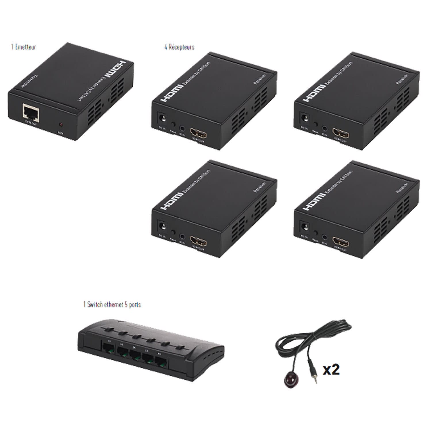 Kit extendeur HDMI 1 vers 4 sur IP + switch - Full HD 1080p - 7.2 gbps - compatible réseau TCP/IP - déport de téléco - possibilité d'ajouter des récepteurs supplémentaires - plug & play - boitiers métal - 80m point à point