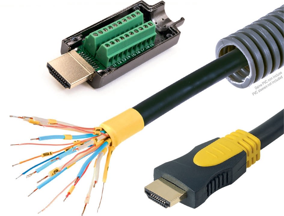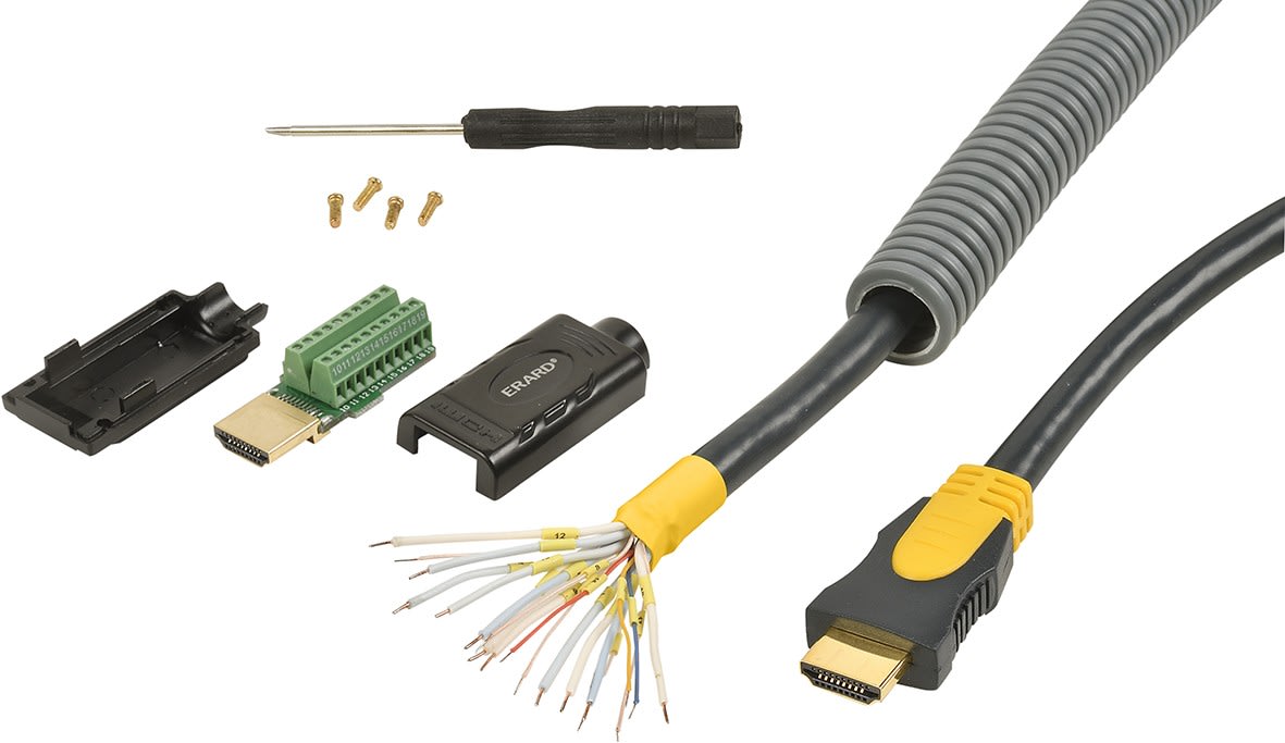 Pour répondre aux contraintes de passage de câbles sur vos chantiers d’intégration Audio-Vidéo, ERARD® a développé une solution « clé en main » qui permet de connecter facilement une prise HDMI mâle après avoir passé le cordon dans une gaine PVC de diamètre 20 mm.Idéal pour les passages dans les gaines de faible diamètre avec une double possibilité : reconstitution d'un cordon M/M ou connexion à plastron à bornier à vis.Les 20 fils dénudés, étamés et numérotés peuvent également être connectés sur les plastrons HDMI ERARD®. Dans cette configuration, le branchement entre la source (1080p) et le display ne devra pas dépasser 22 mètres.Pour salles de réunion, installations en faux-plafond ou autres passages de câbles avec contraintes importantes sur le rayon de courbure...