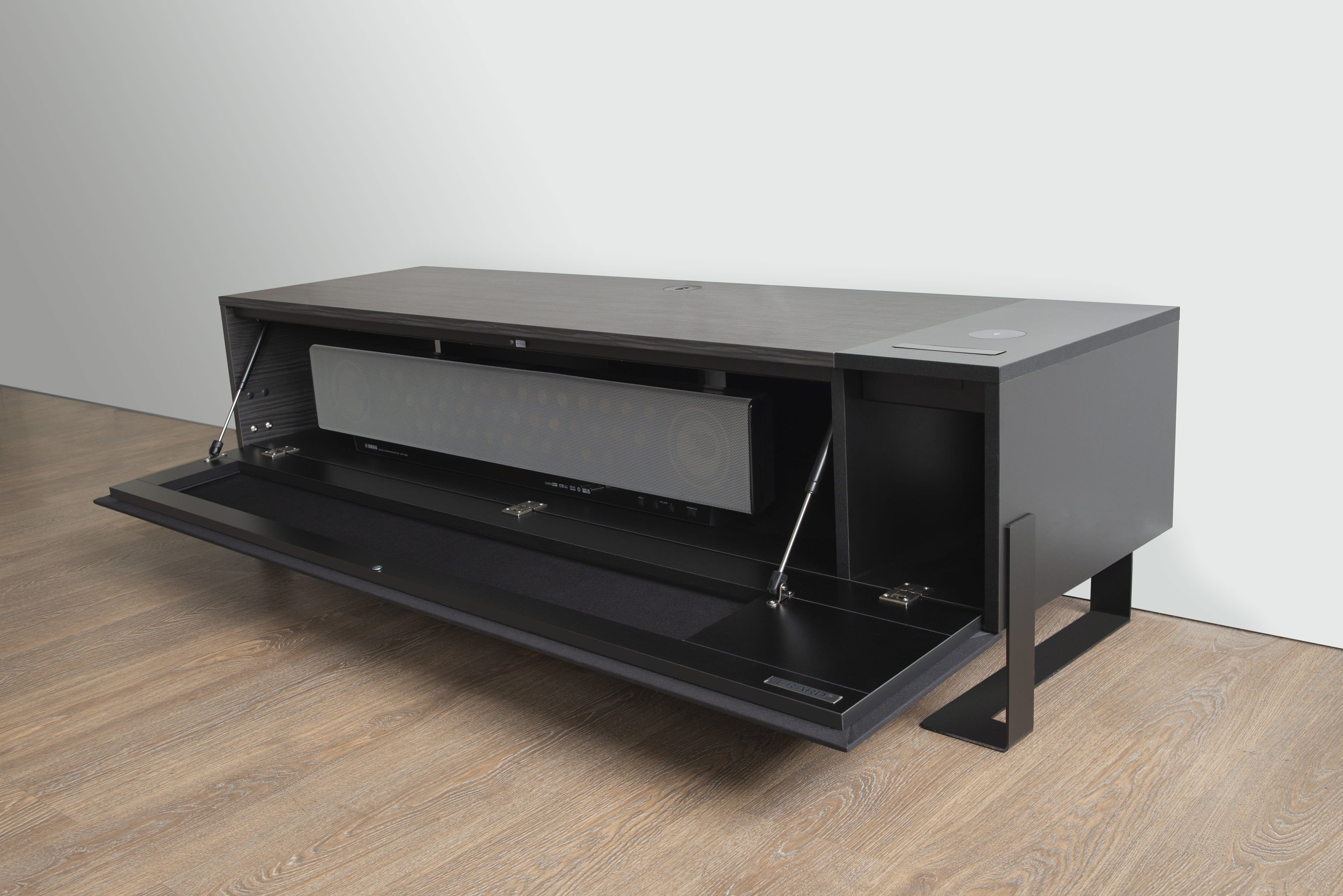 NAGA 1600 S Carbon, avec porte en tissu afin de pouvoir insérer une barre son dans le meuble. Le meuble comprends une trappe pour la charge des smartphones et autres + chargeur QI + Chargeur 4 USB.
