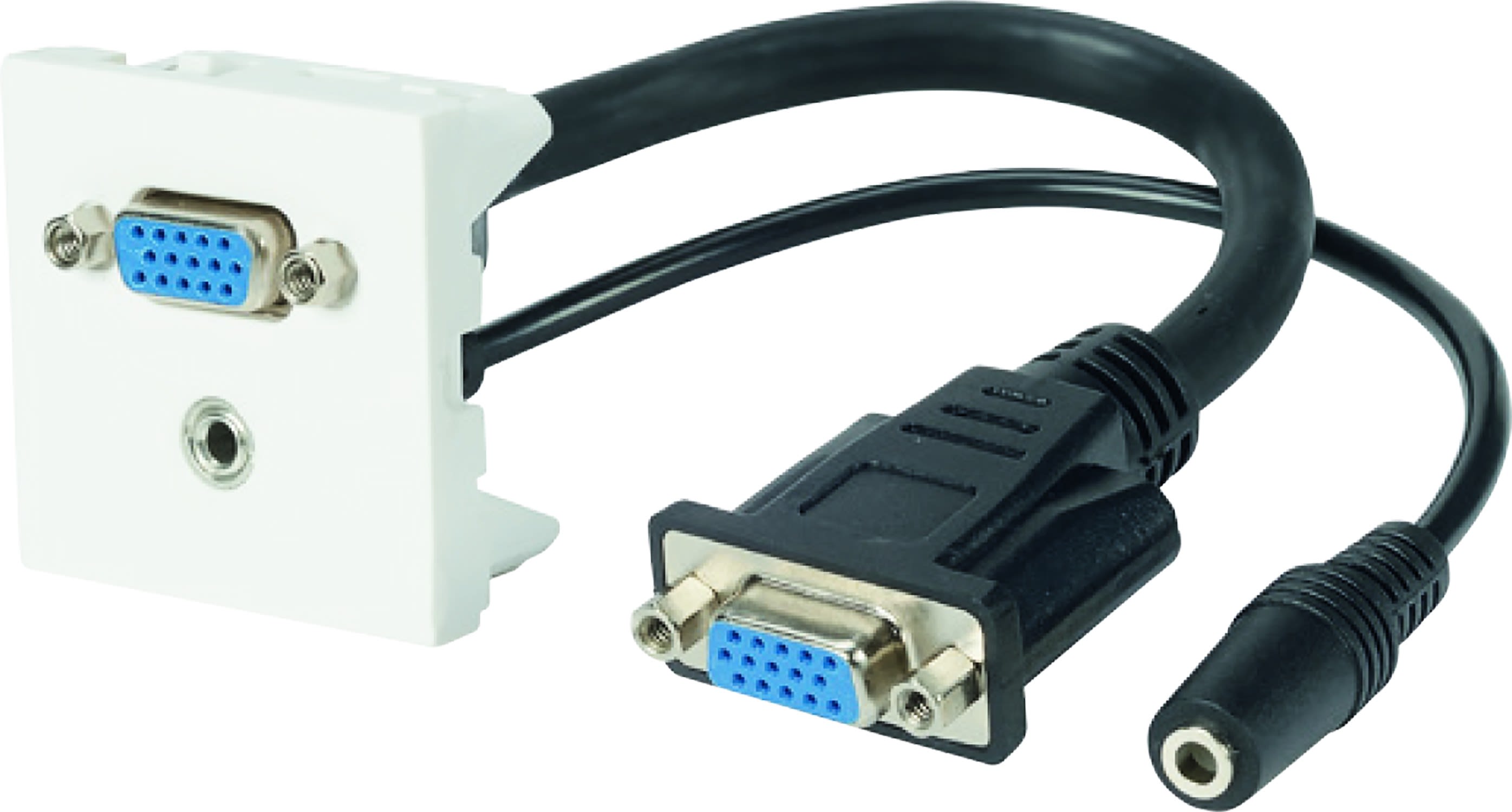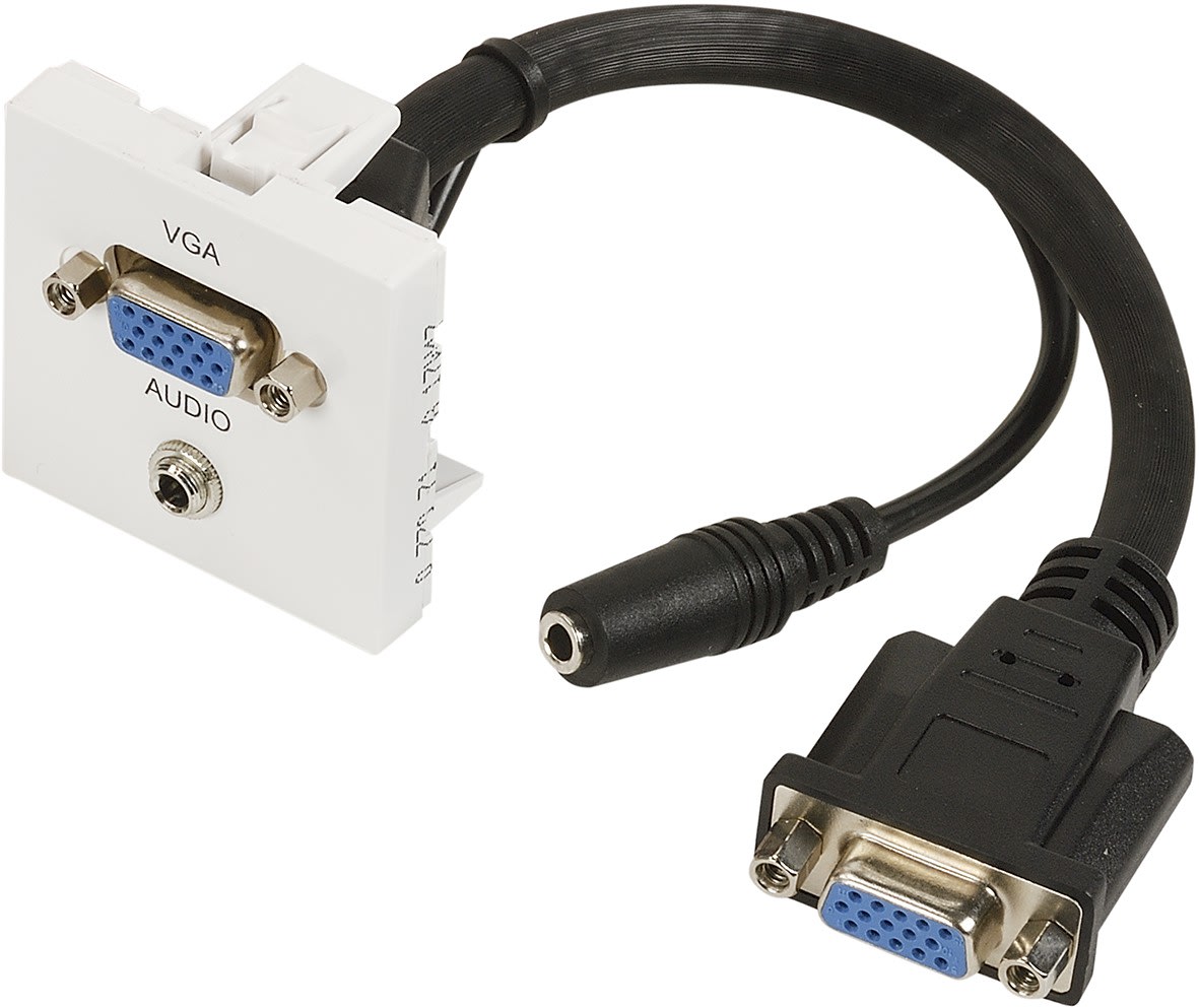 Permet d'intégrer une prise VGA (vidéo) et une prise Jack 3.5 mm (audio stéréo) dans une goulotte ou une interface multimédia.Plastron câblé et monté dans nos ateliers sur la base d'obturateur LEGRAND