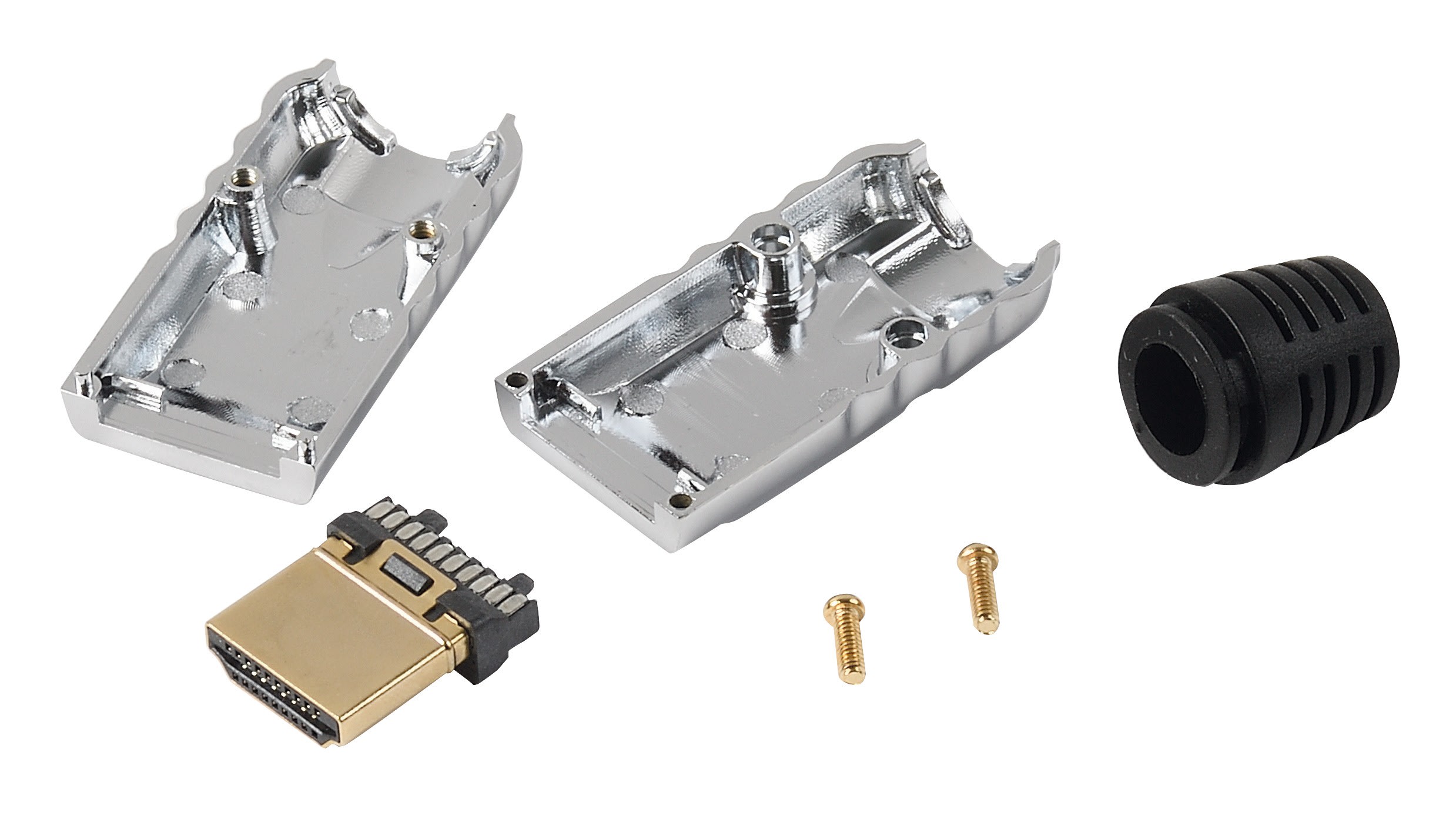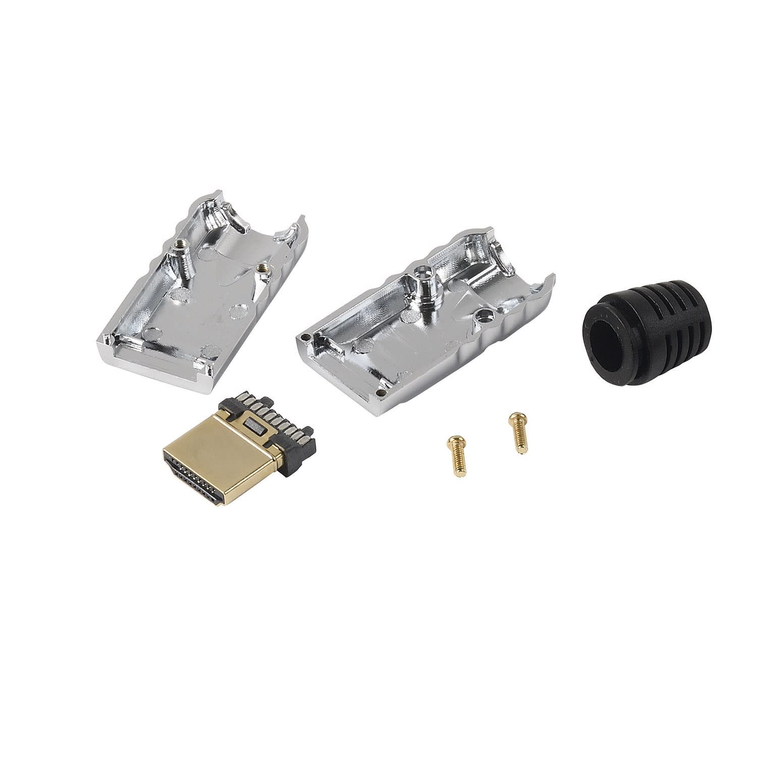 Composition :1 prise HDMI 20 contacts à souder1 double-coque métal1 manchon PVC - diam. 8 mm intérieur2 vis