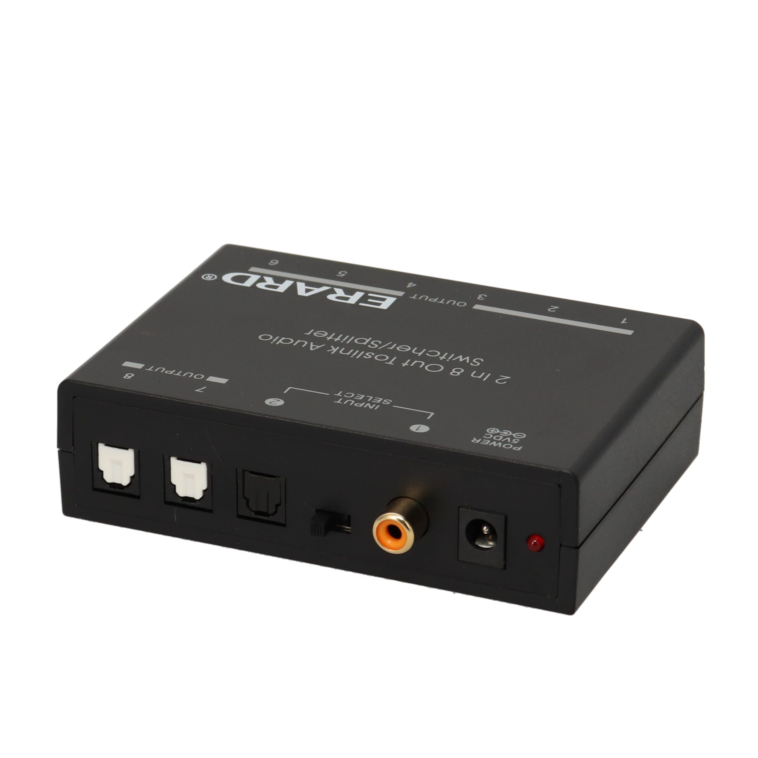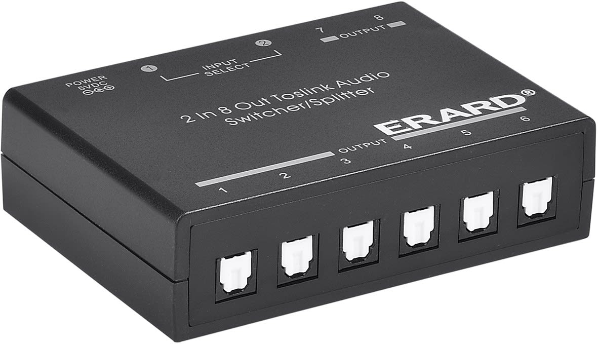 Répartiteur Toslink - Entrée : 1 Toslink + 1 RCA vers Sortie : 8 Toslink - amplificateur intégré - plug & play - boitier pvc - alimentation 5V/1A fournie