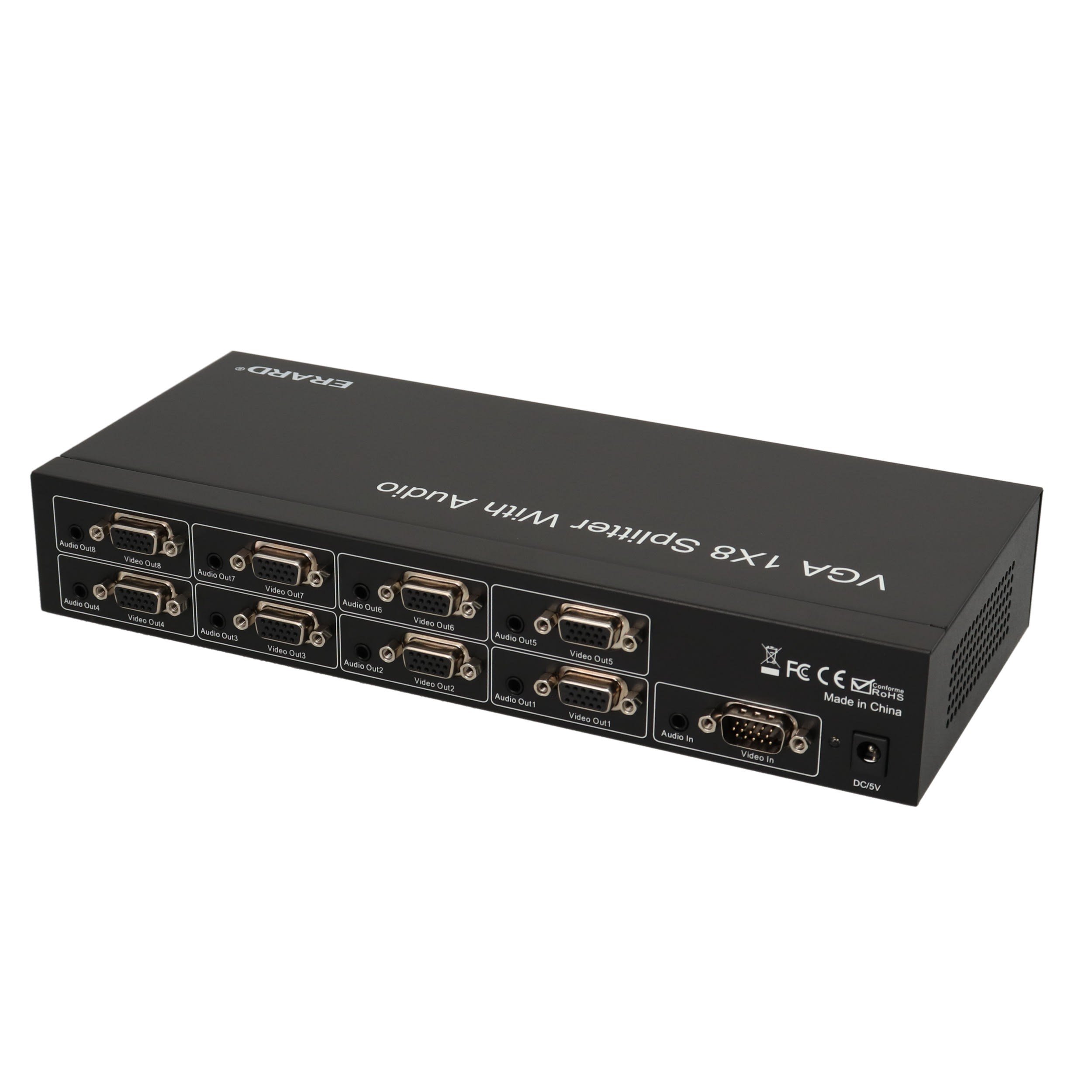 Répartiteur VGA + audio 1 vers 8 - Résolution max 1920x1200p - synchronisation automatique des résolutions - Alimentation fournie (5V/2A) - plug & play - boitier métal -dimensions : 267 x 115 45mm - poids 810g