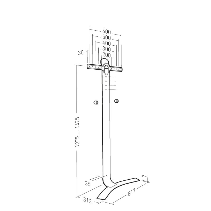 • Colonne et support écran, en acier.• Système anti-décrochement de l’écran.• Patin stabilisateur en élastomère repositionnable.• Hauteur d’écran ajustable sur 200 mm (5 positions).• Système de sécurité anti-décrochement de l’écran.• Structure en acier 5 mm, peinture époxy noire et blanche.• Gestion des câbles au dos.• Livré en 3 parties, montage en 5 minutes avec outil fourni.