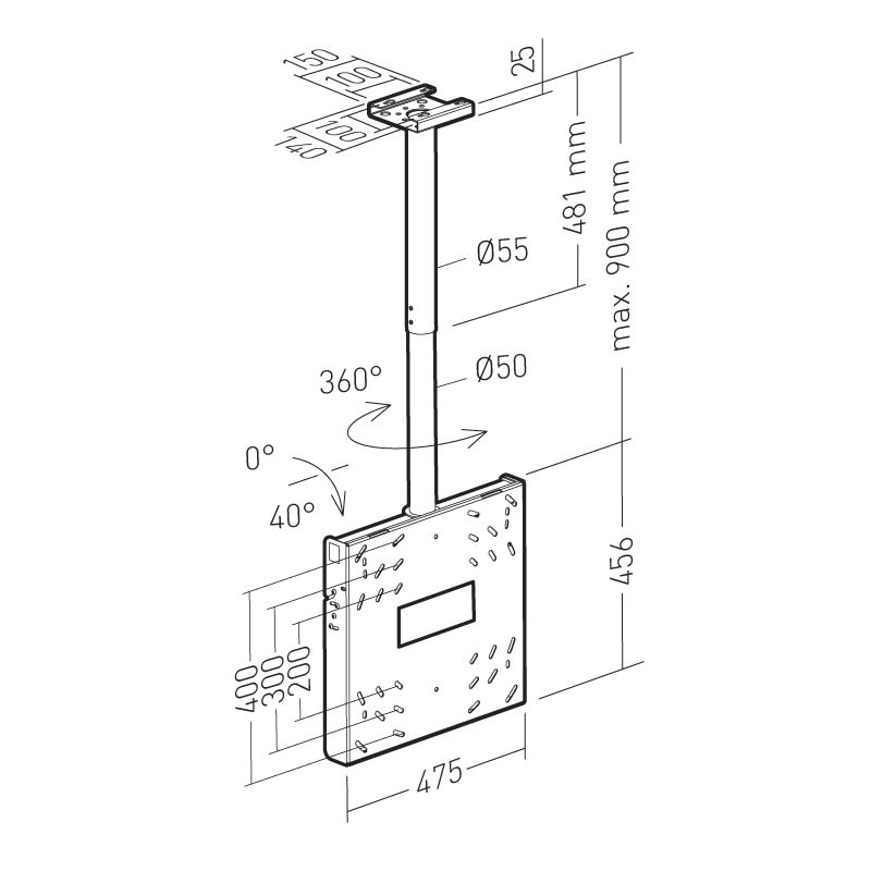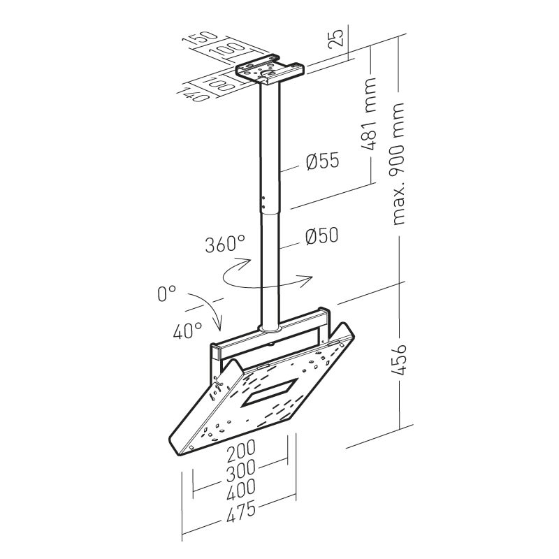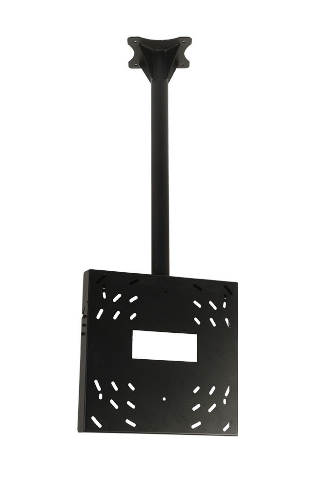 • Platine plafond, potence et support écran, en acier.• Peinture époxy poudre.• Réglages de l'inclinaison et de l'orientation.• Blocages avec clé spécifique fournie.• Longueur de la potence ajustable.• Montage en mode portrait possible pour tout type de VESA.• Espace disponible derrière l’écran pour fixation d’un player.